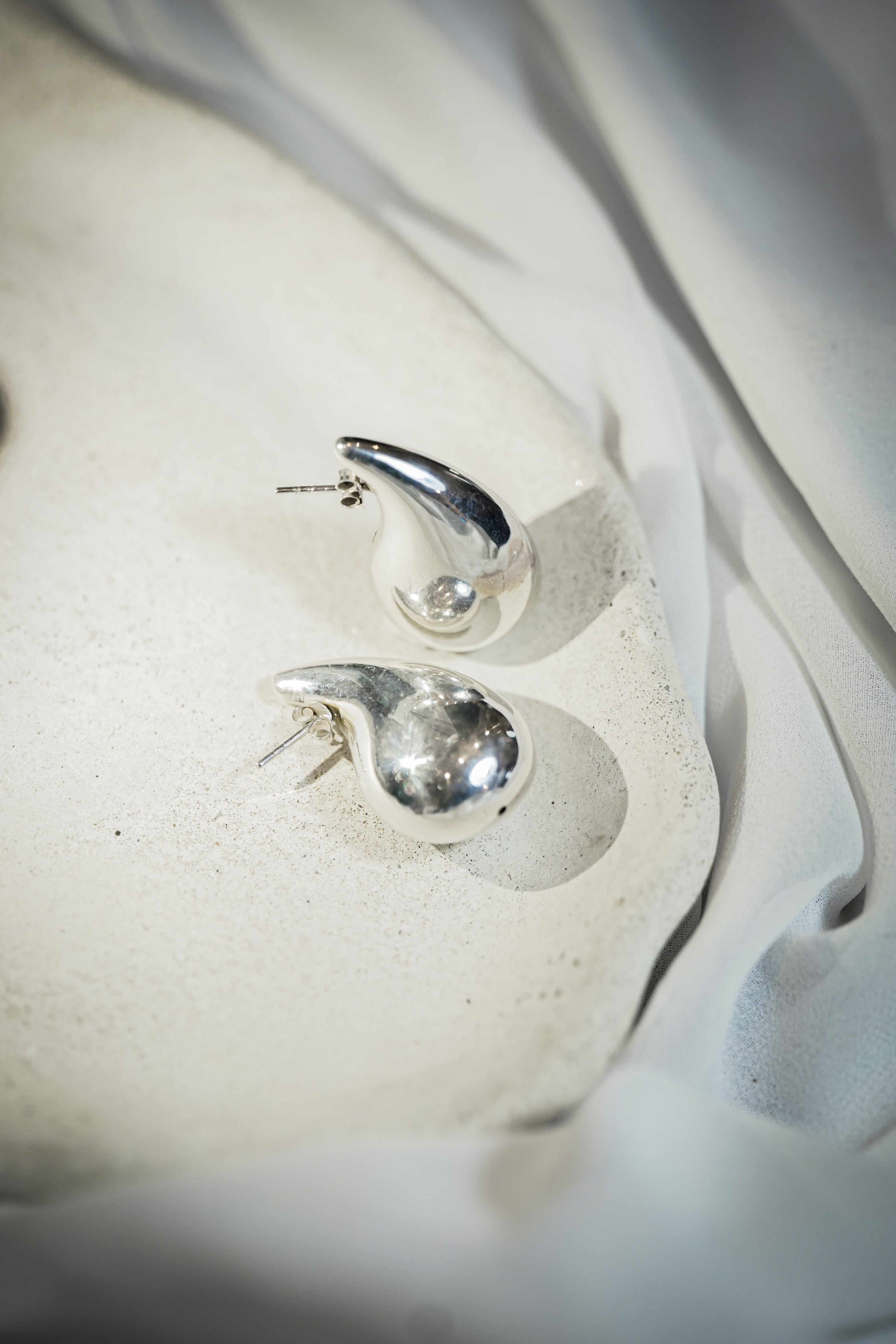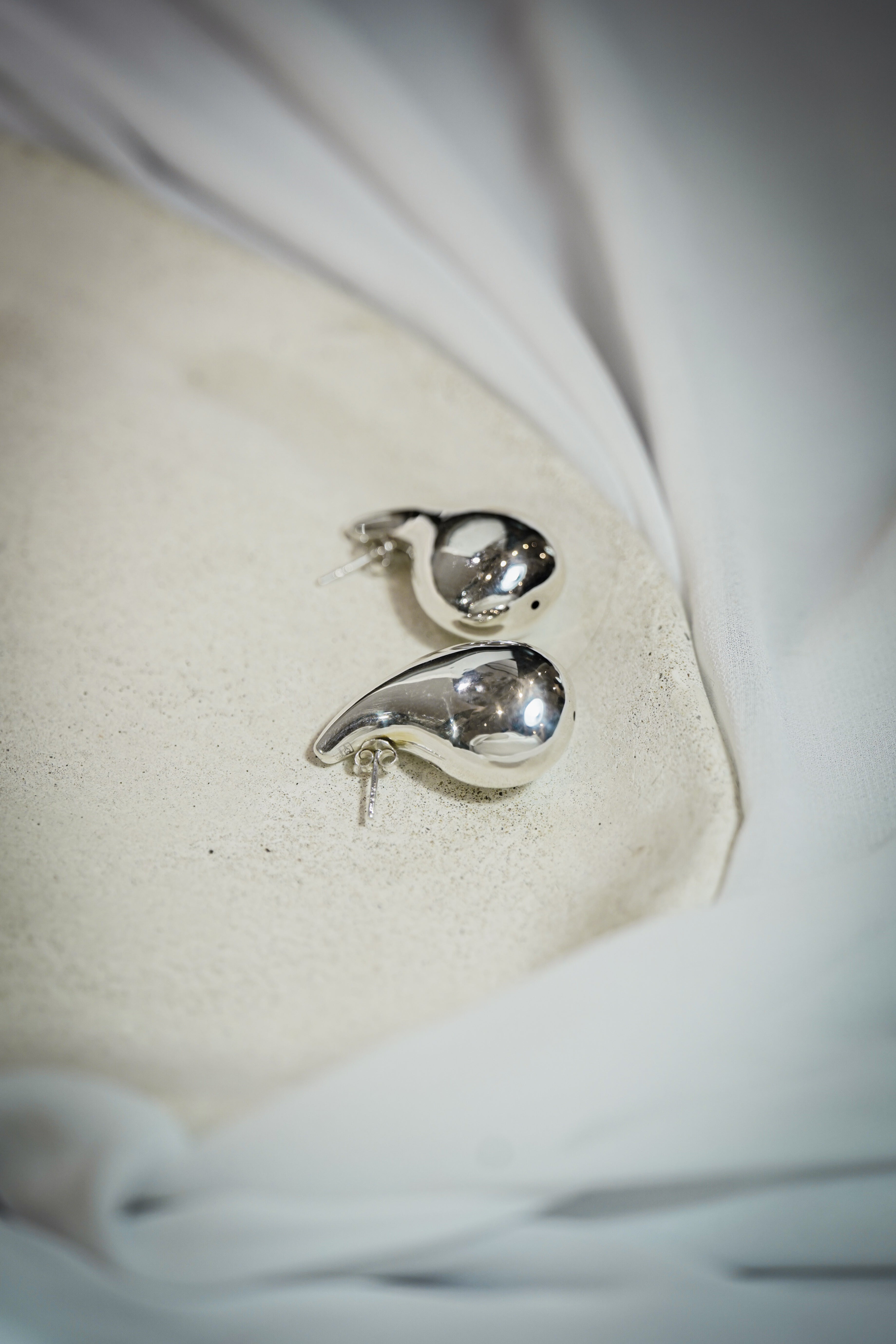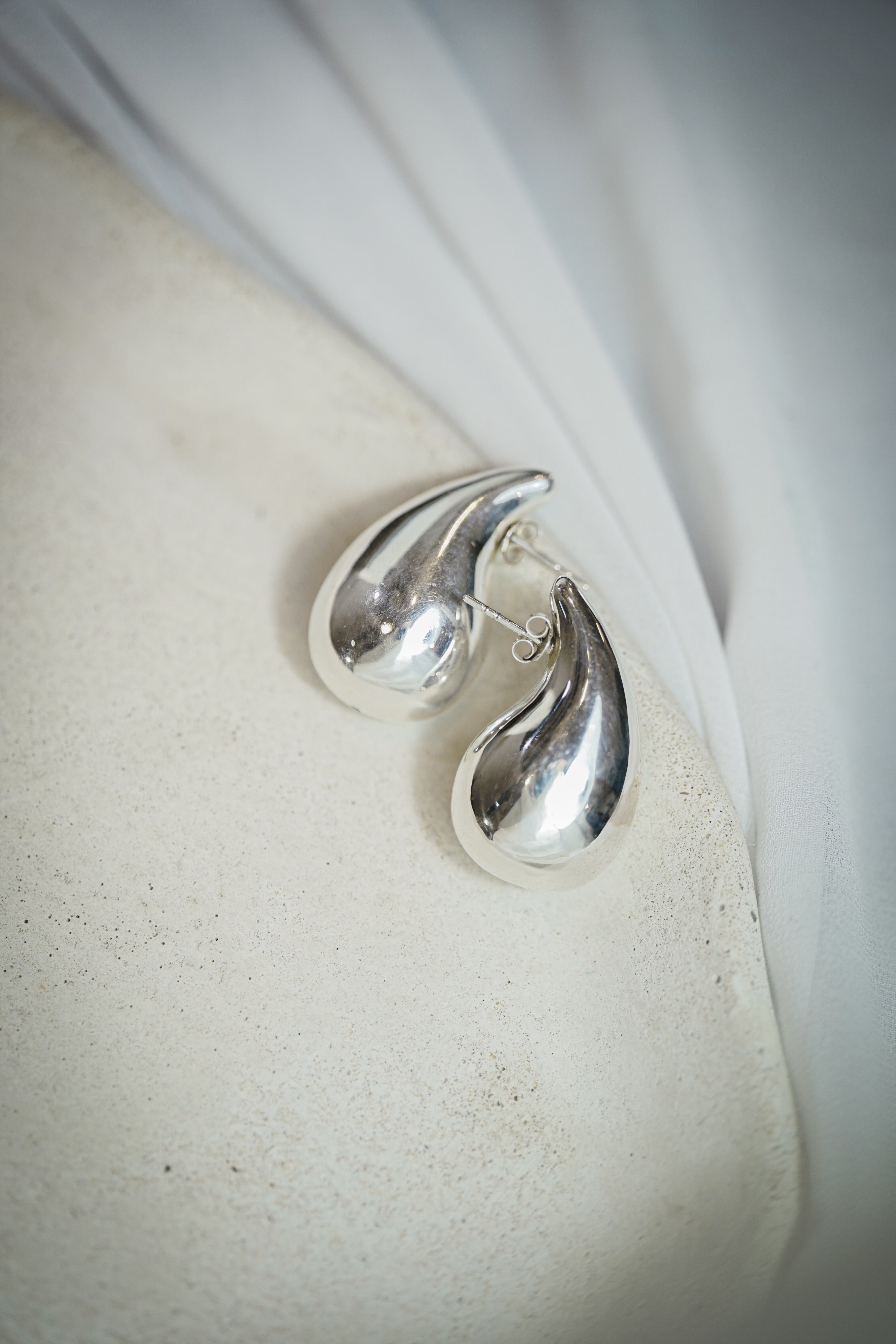 Bold, sculptural earrings featuring a high-polish tear-drop design. Crafted entirely from pure 925 Sterling Silver and authenticated with the official Kuwait Ministry stamp for certified purity and sophisticated luxury.