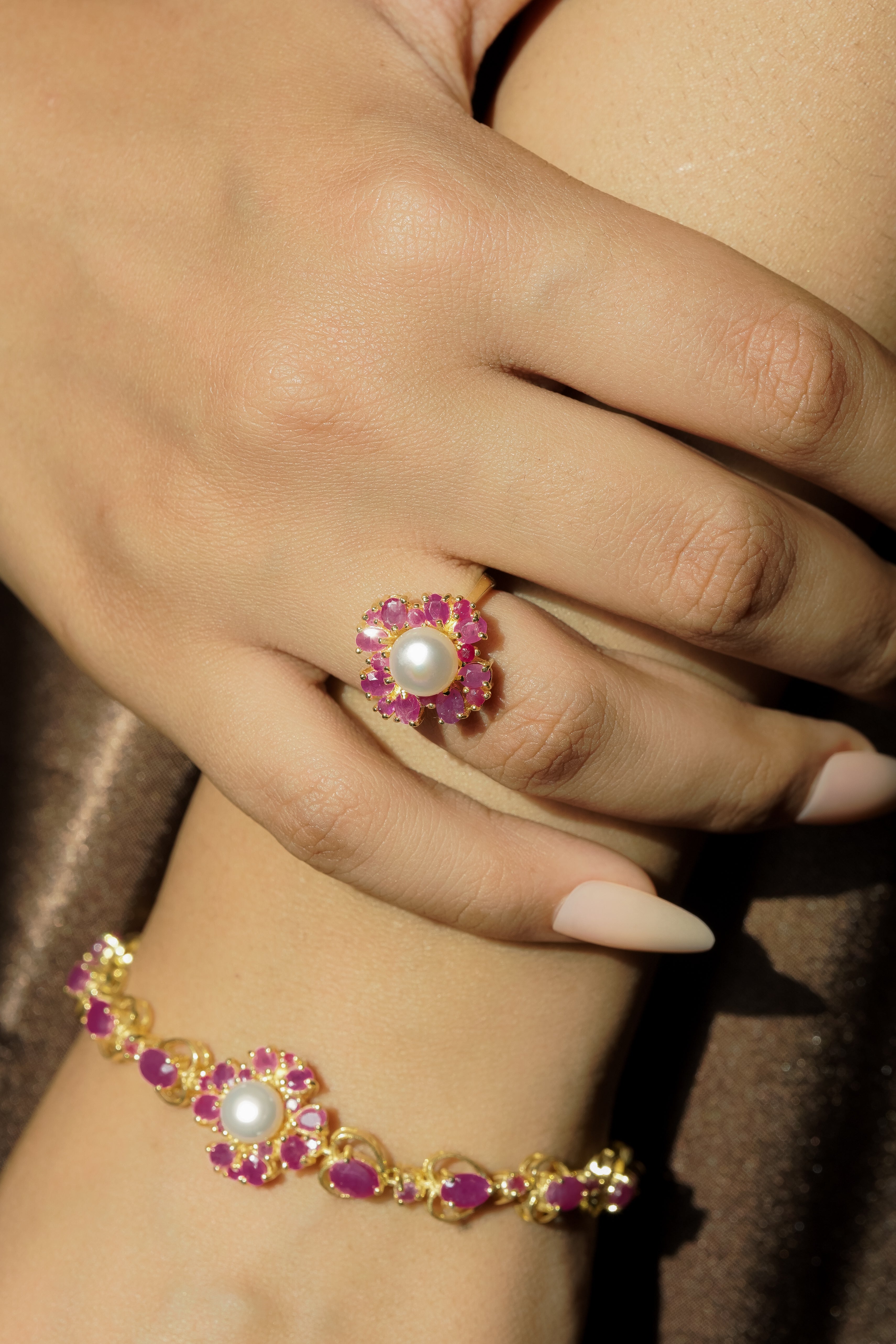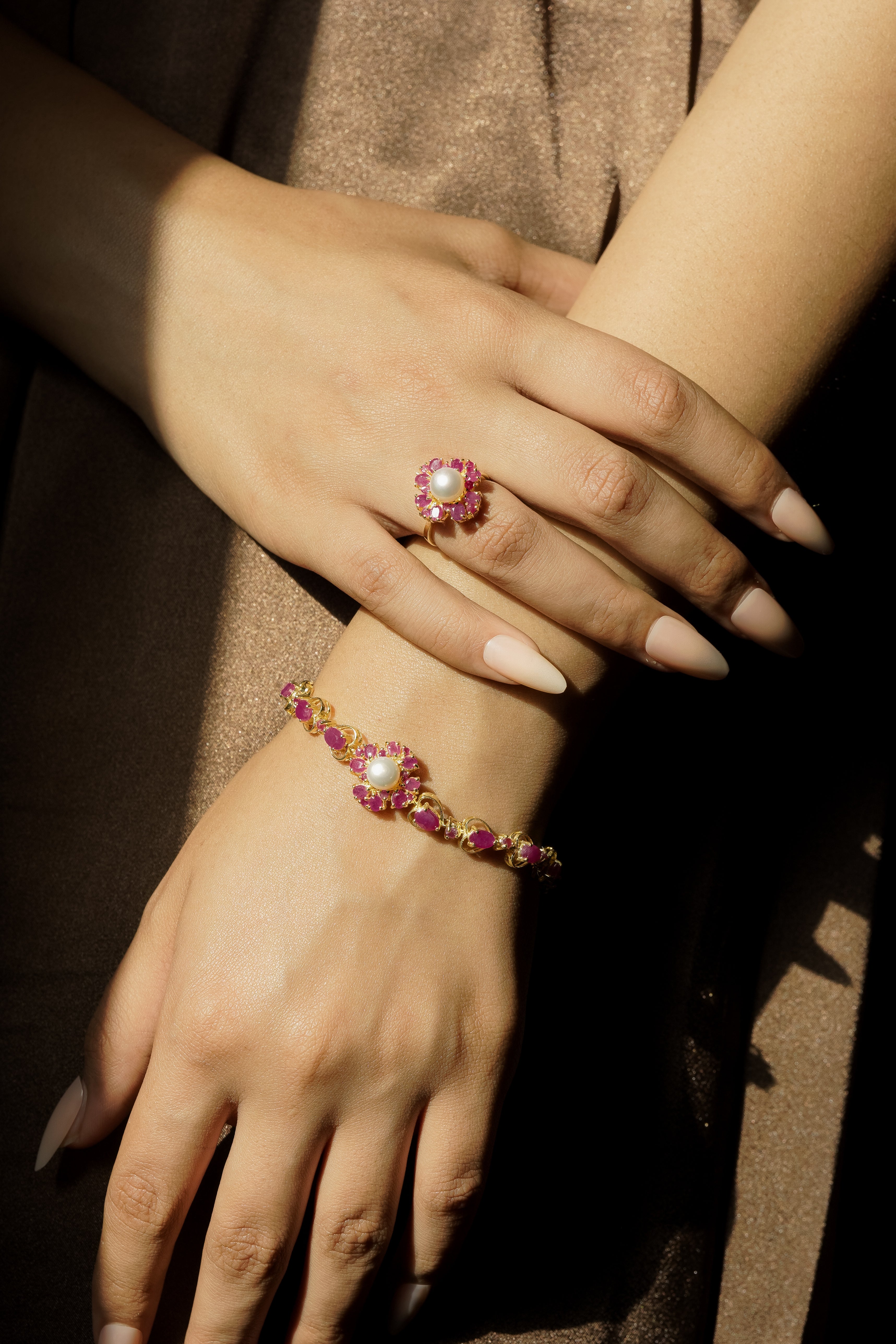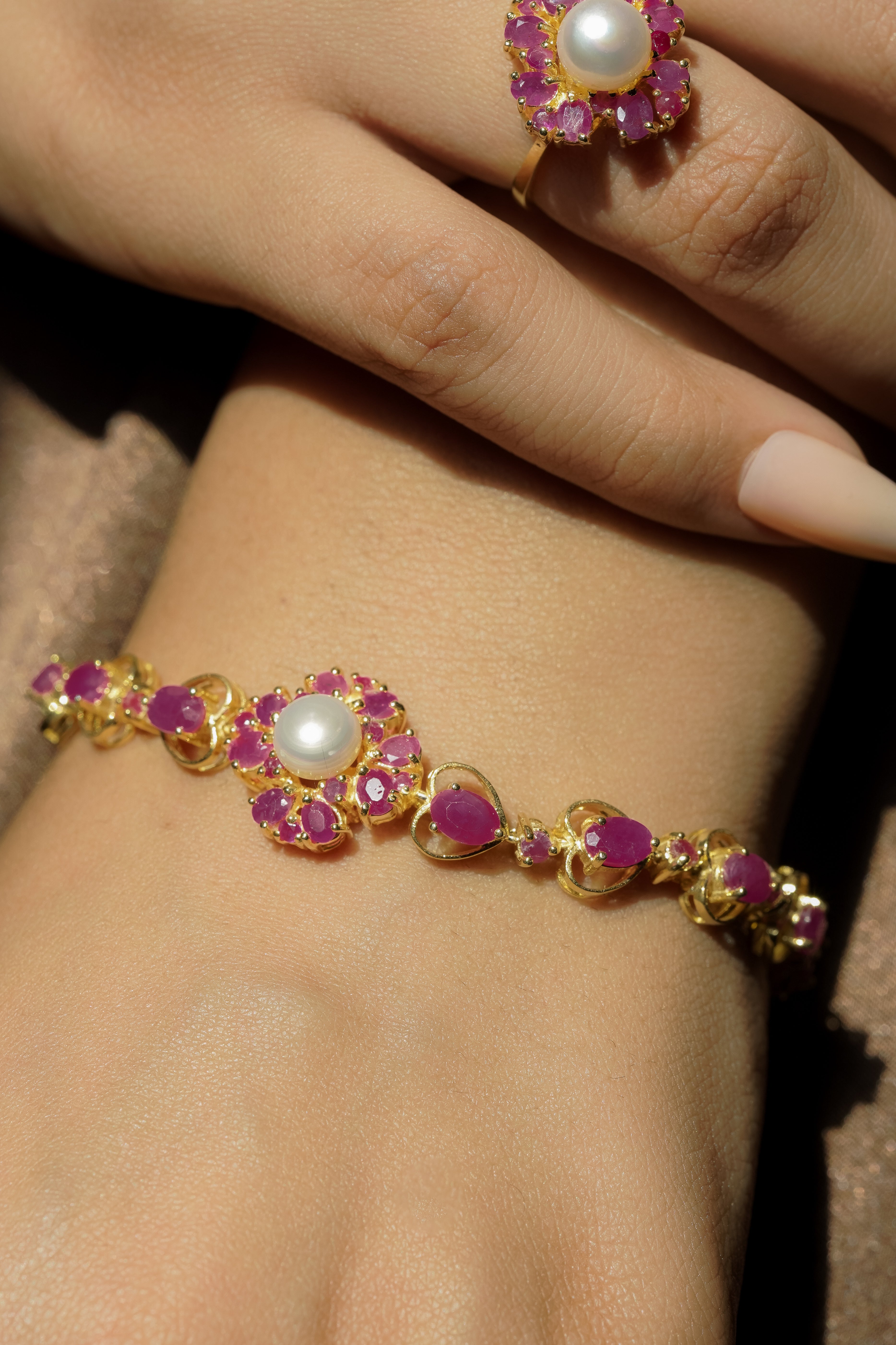 A stunning set featuring a ring and bracelet with cultured Pearls at the center of a floral setting, accented by vibrant red Rubies. Finished with Gold Plating over 925 Sterling Silver and authenticated by the Kuwait Ministry stamp.