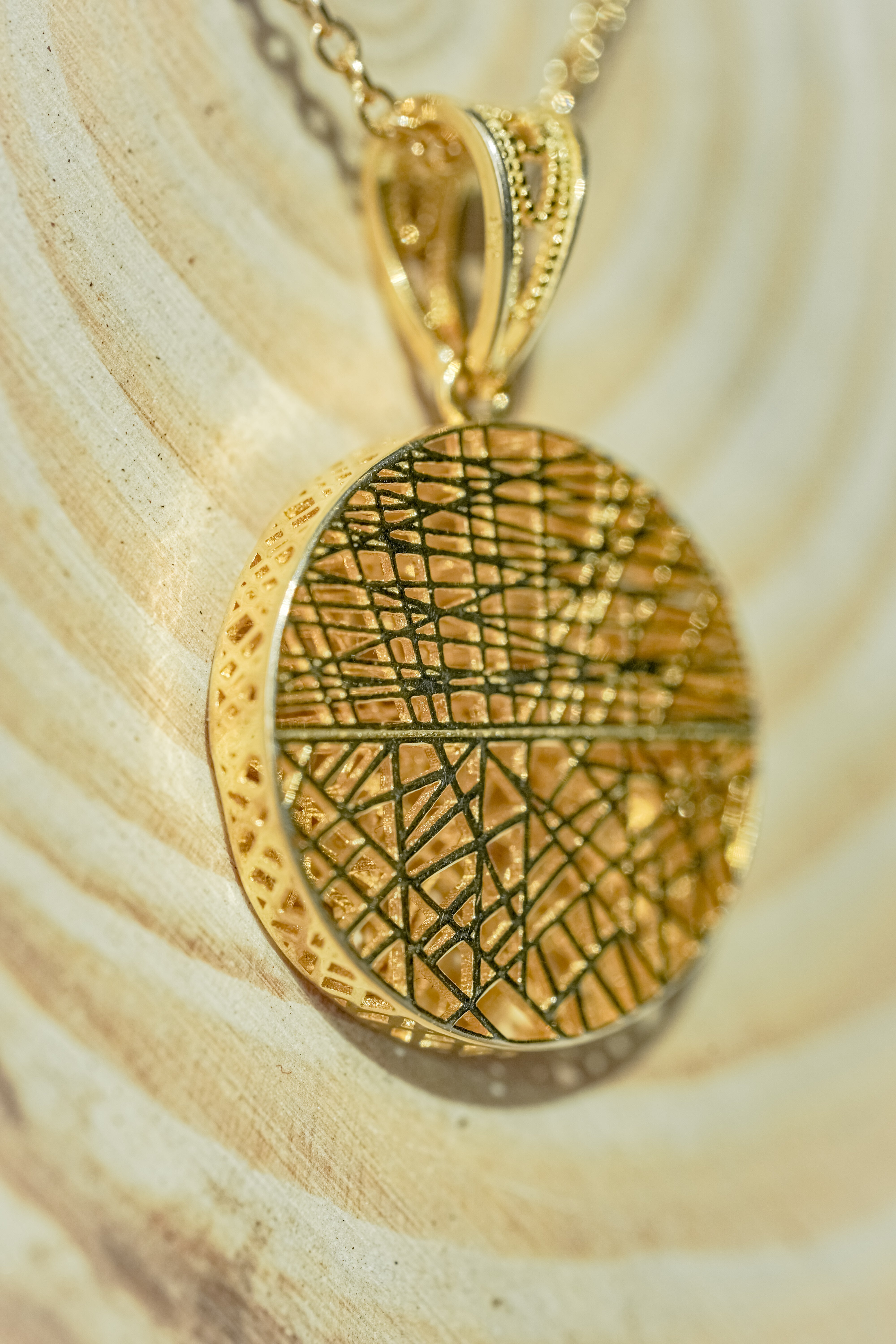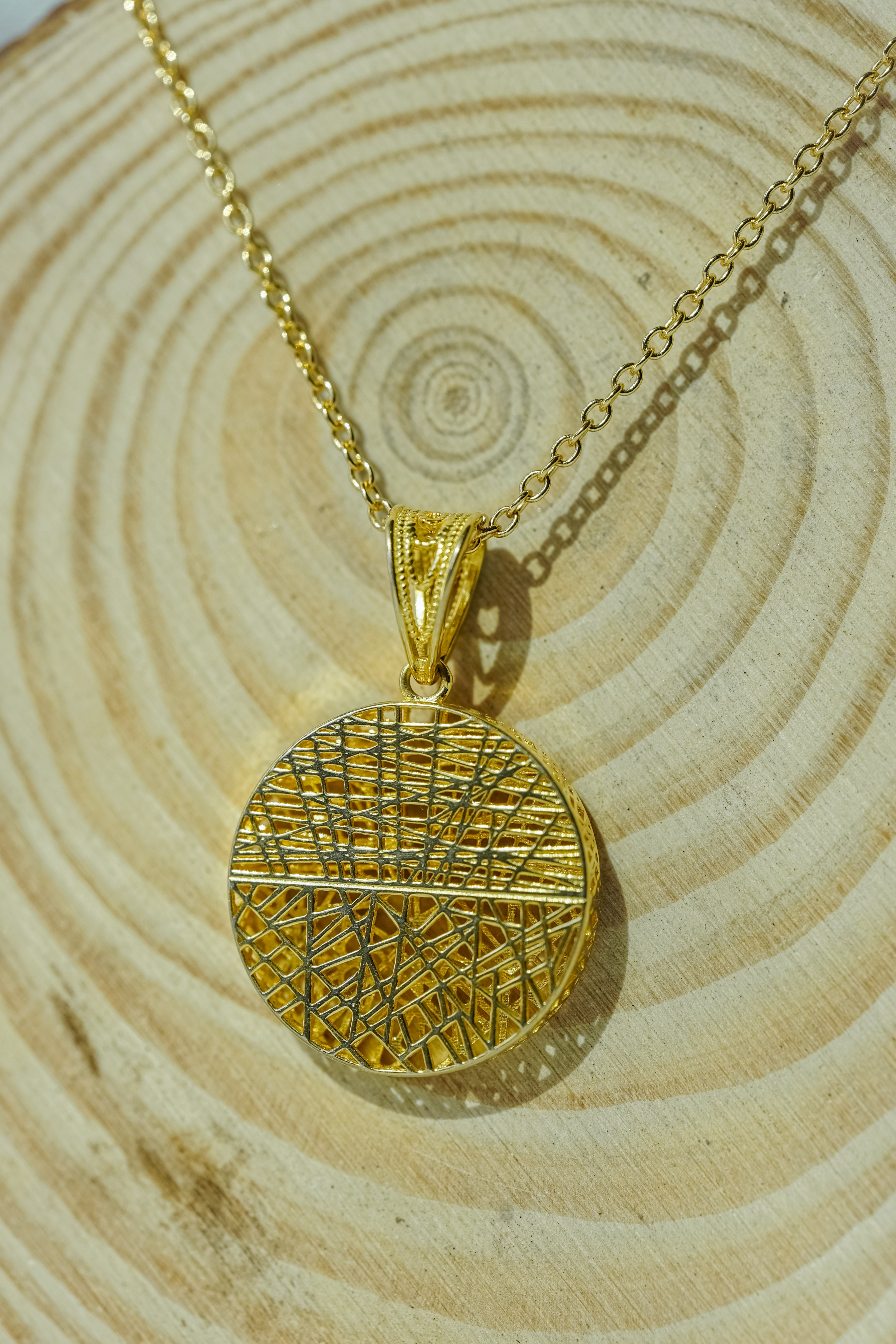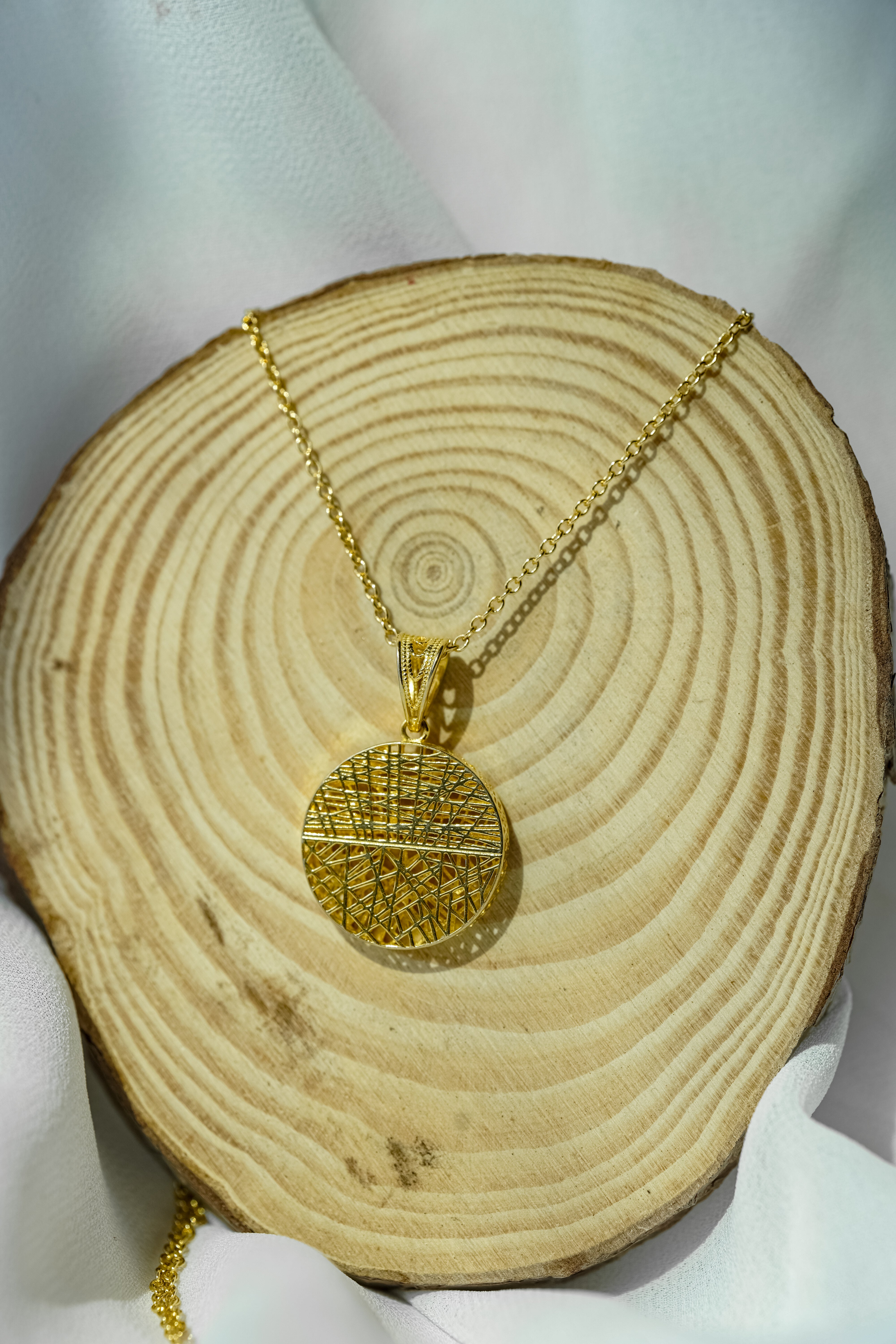 A distinctive circular pendant featuring an intricate, segmented Turkish Design lattice. Finished with rich Gold Plating over fine 925 Sterling Silver and guaranteed by the official Kuwait Ministry stamp for certified purity and heritage elegance.