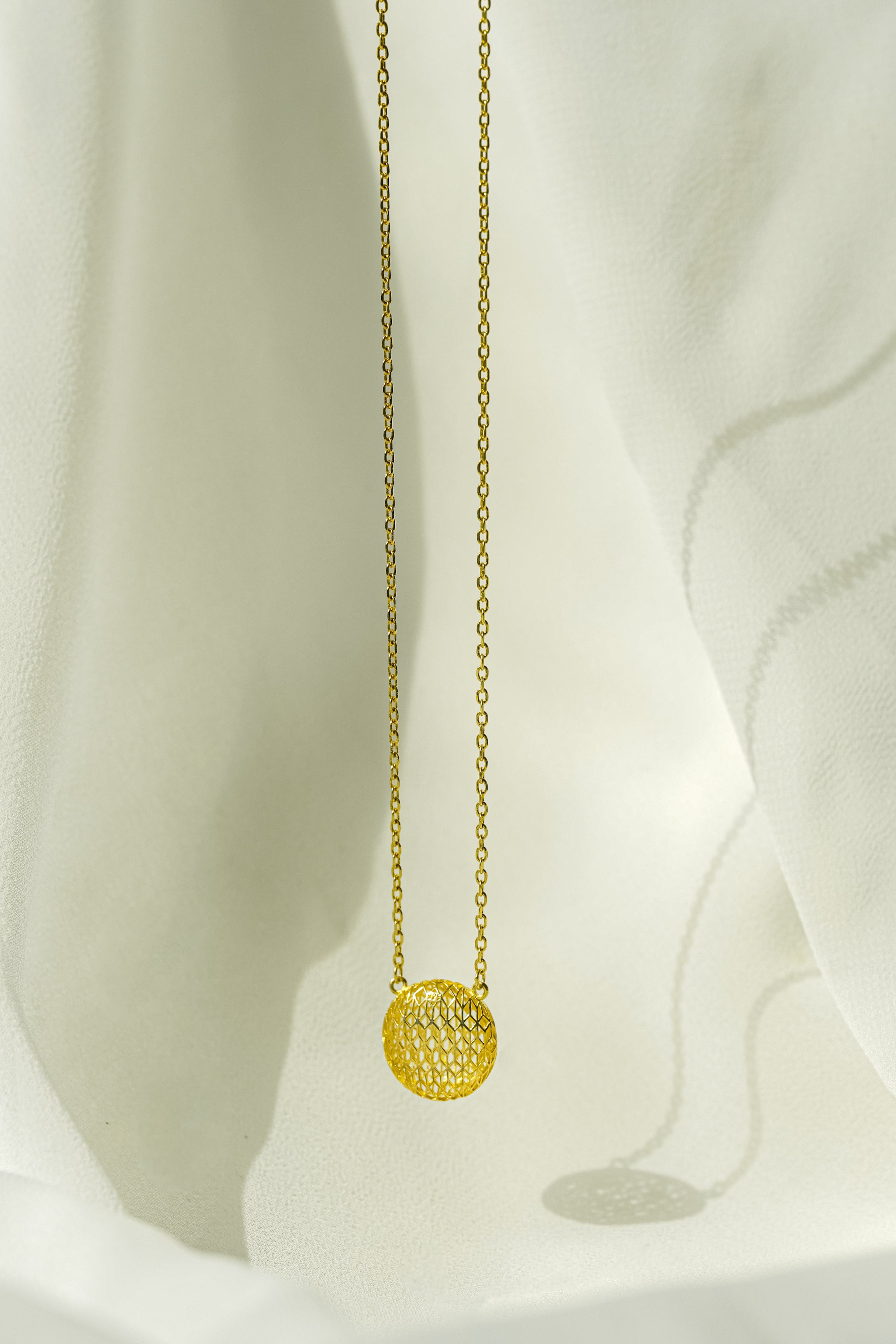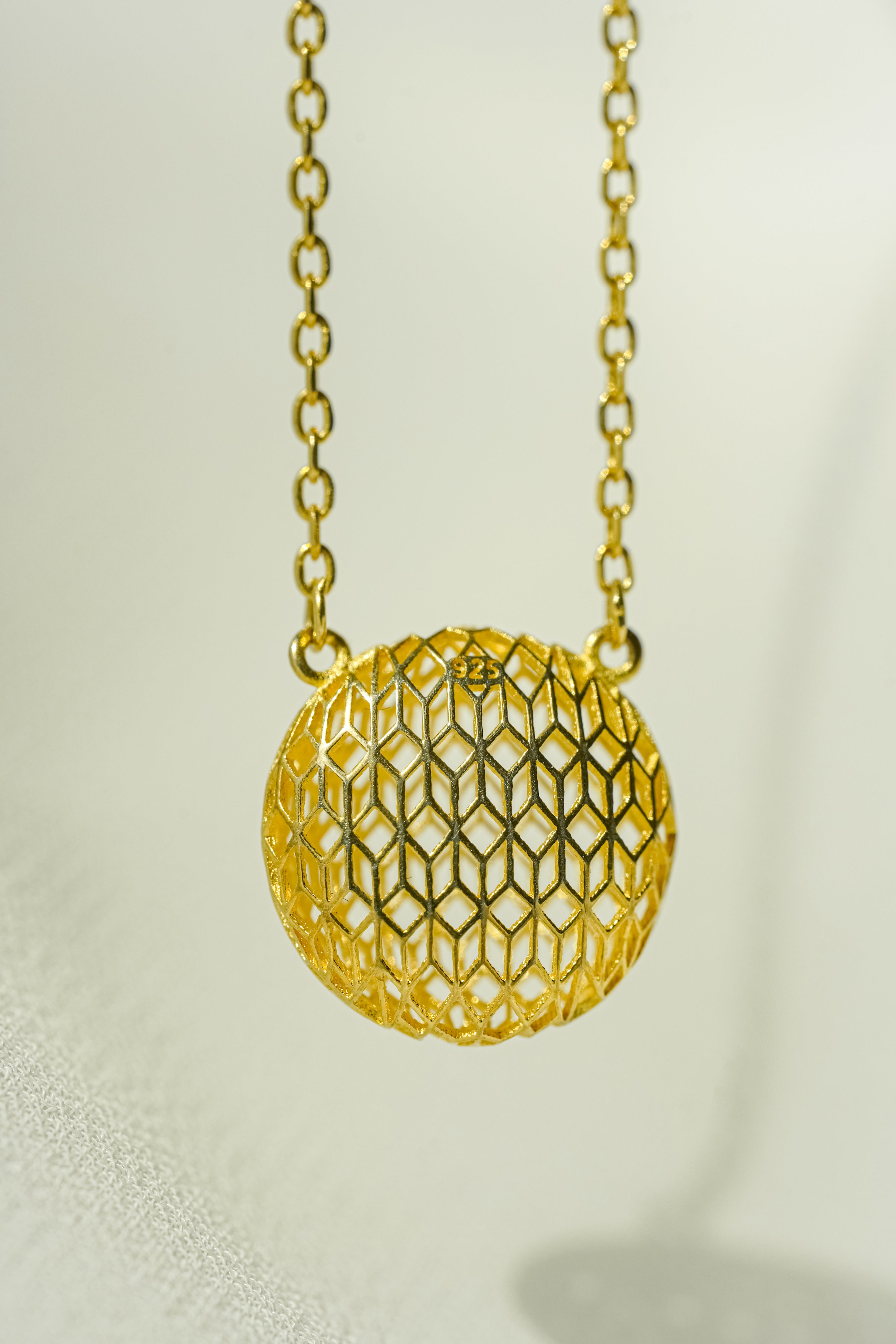 An exquisite pendant featuring a large, spherical design with an intricate Turkish Design honeycomb lattice motif. Finished with rich Gold Plating over fine 925 Sterling Silver and guaranteed by the official Kuwait Ministry stamp for certified purity and elegance.