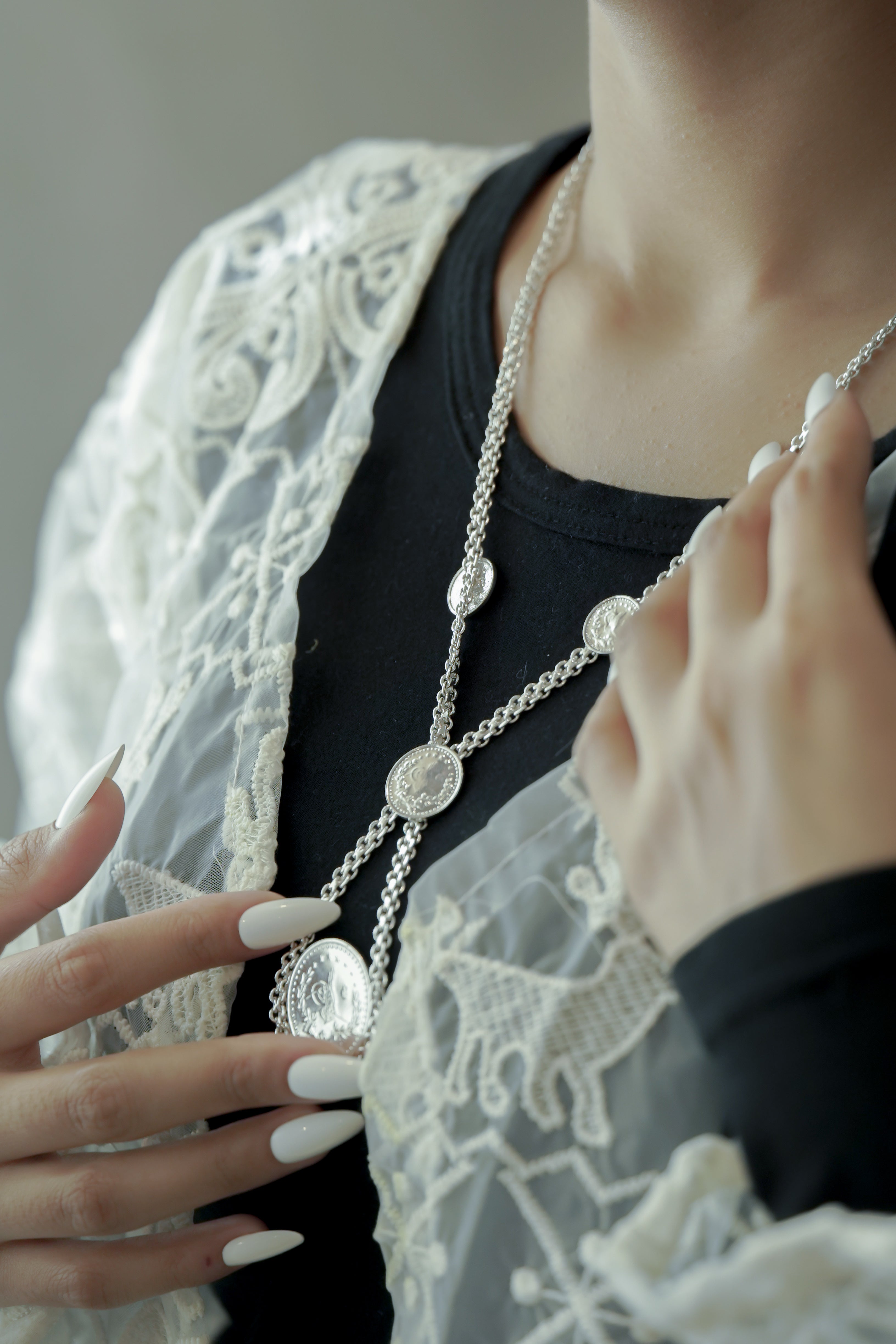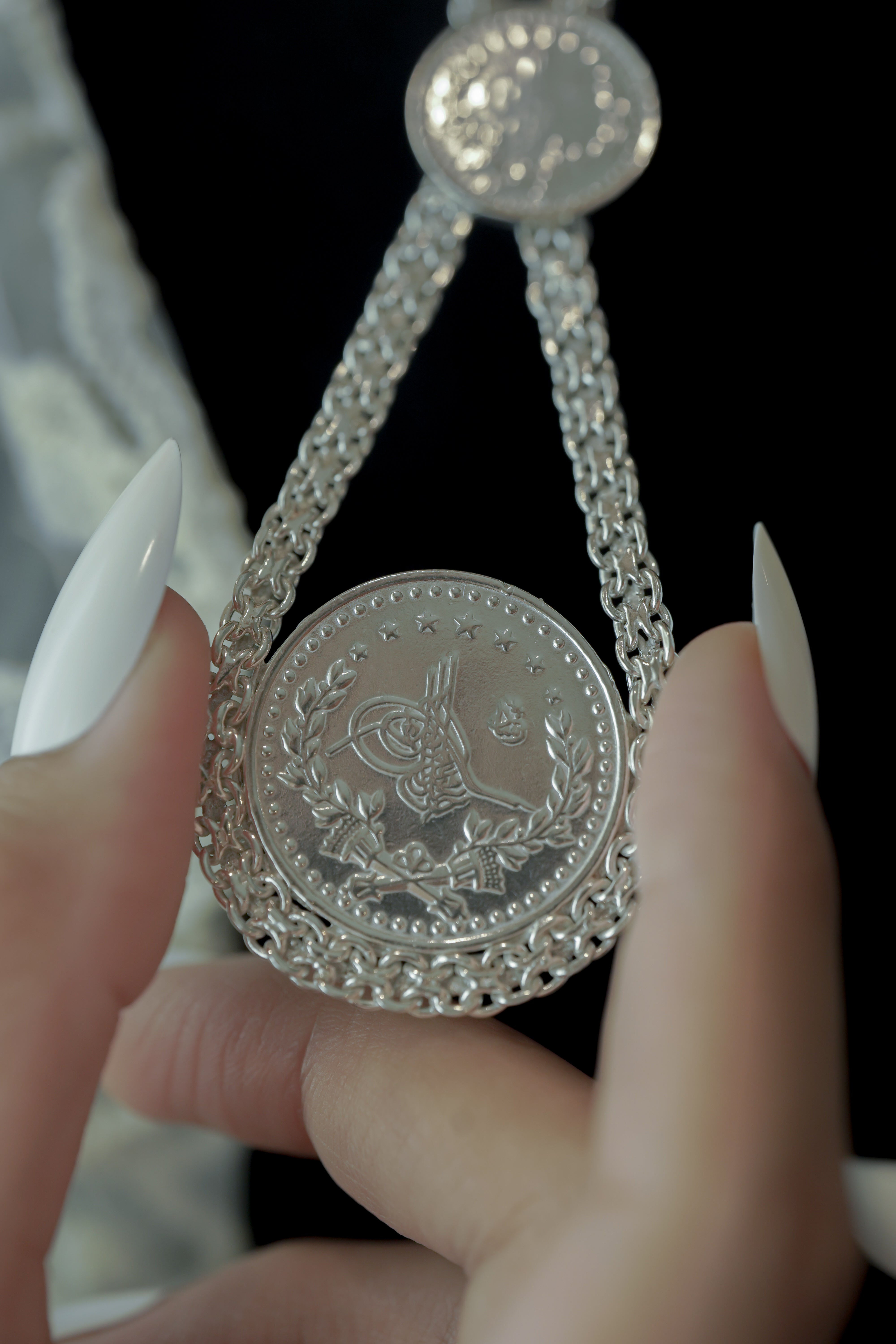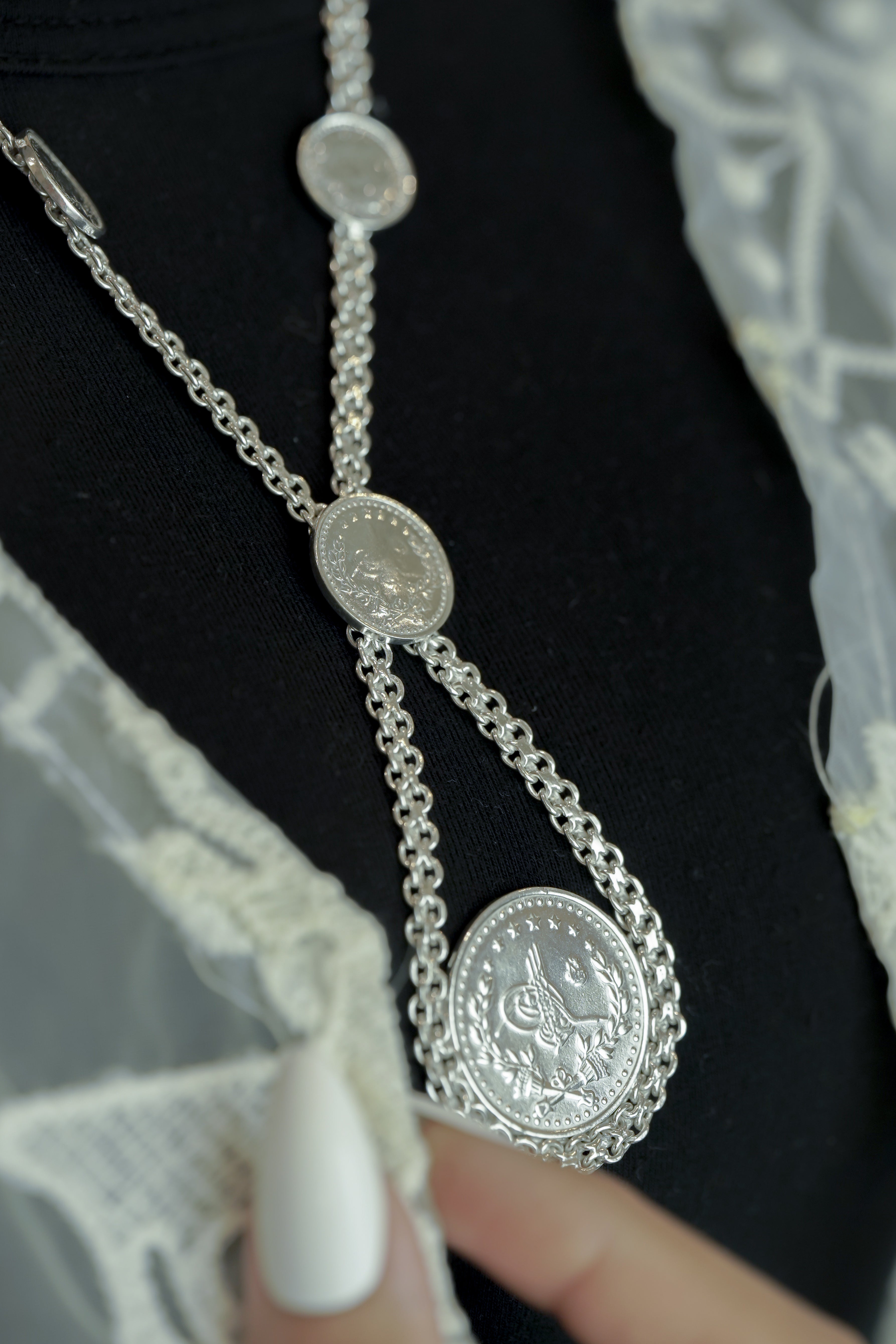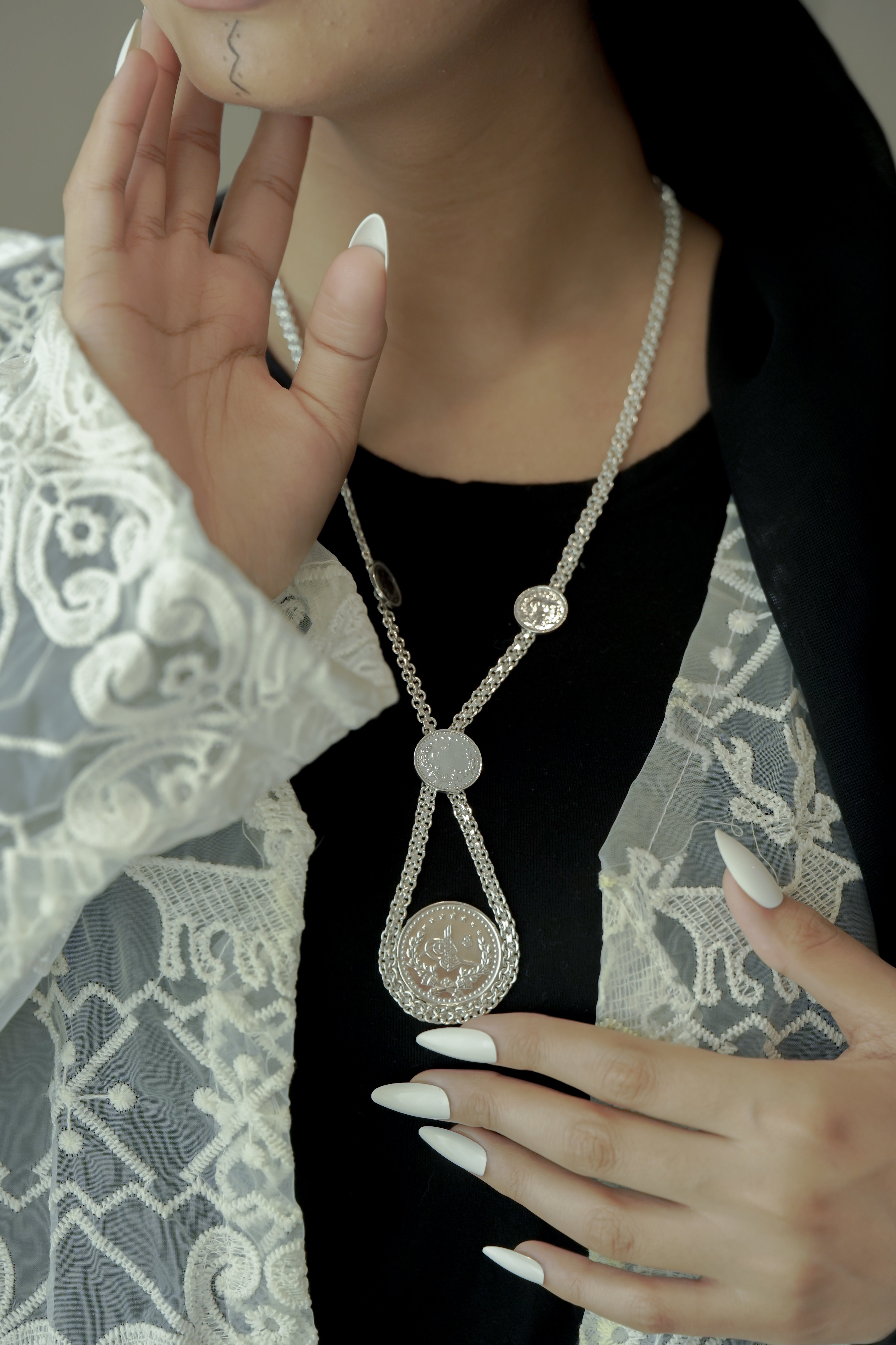 A distinctive silver necklace featuring multiple coin medallions with classic Arabic Design, set on a braided-style chain. Crafted from pure 925 Sterling Silver and authenticated with the Kuwait Ministry stamp for certified purity and timeless heritage.