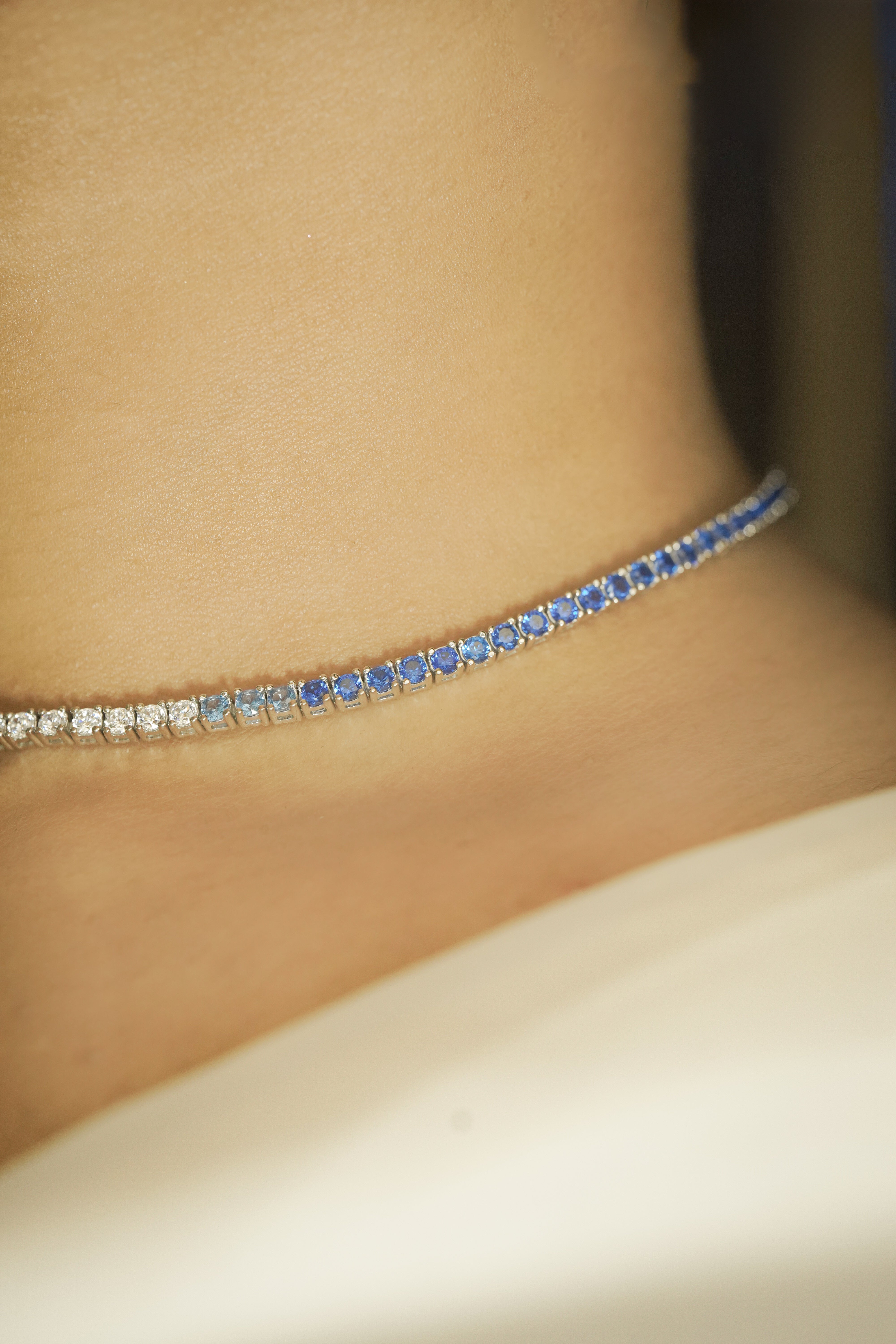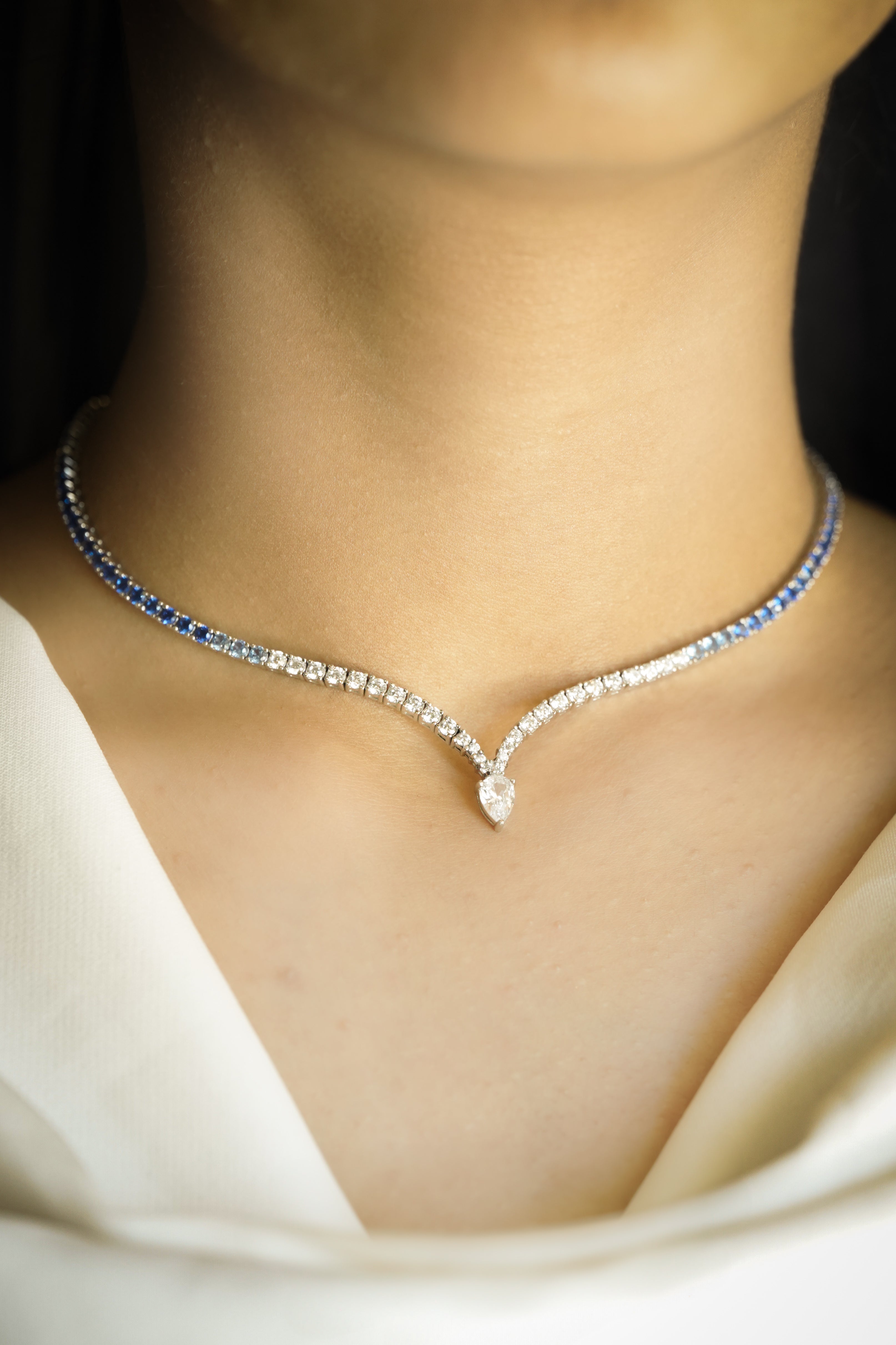 A breathtaking collar necklace featuring a graduated stream of vibrant Blue Zirconia that seamlessly transitions into brilliant White Zirconia, culminating in a central teardrop pendant. Crafted in 925 Sterling Silver and guaranteed by the official Kuwait Ministry stamp for certified purity and exceptional luxury.