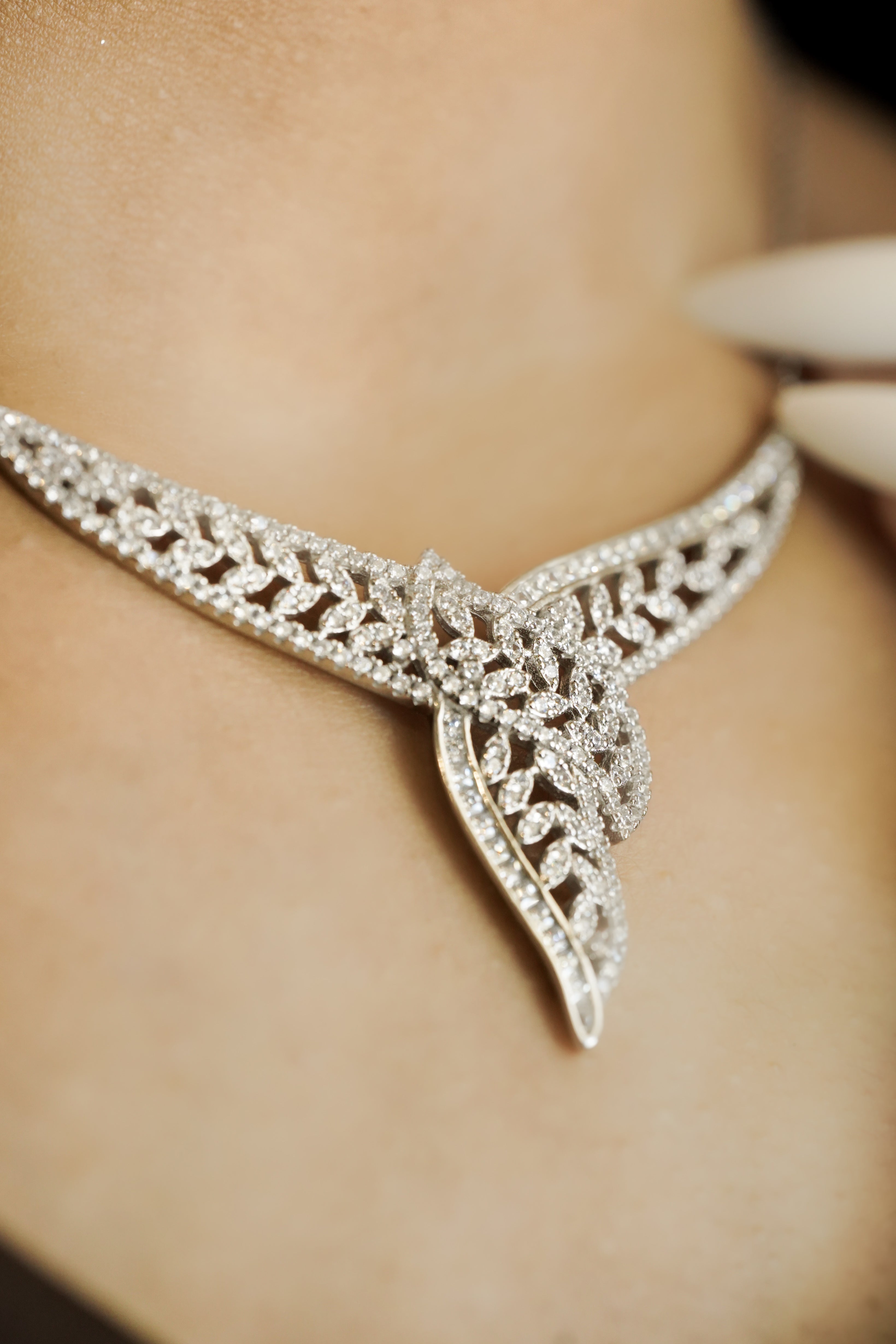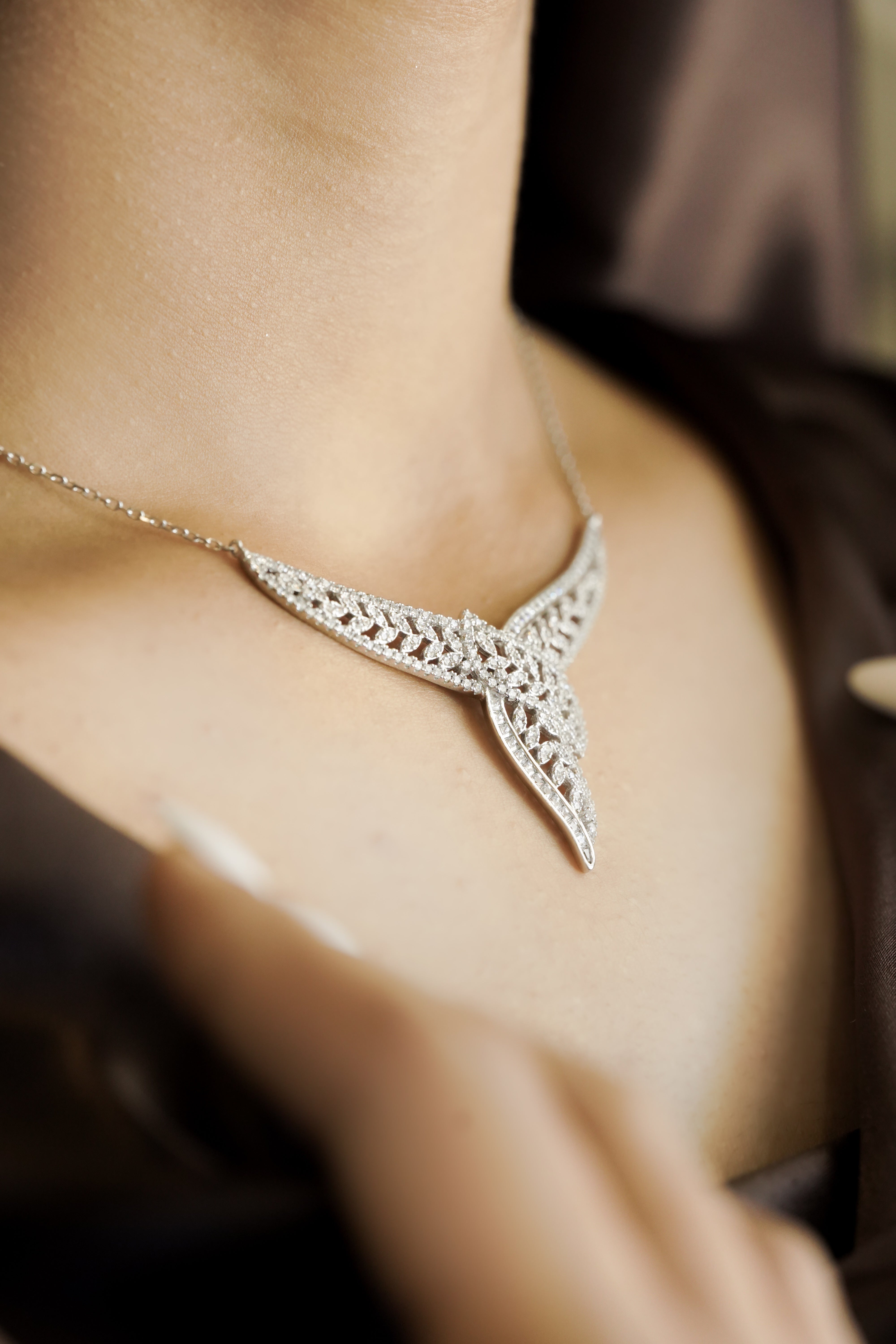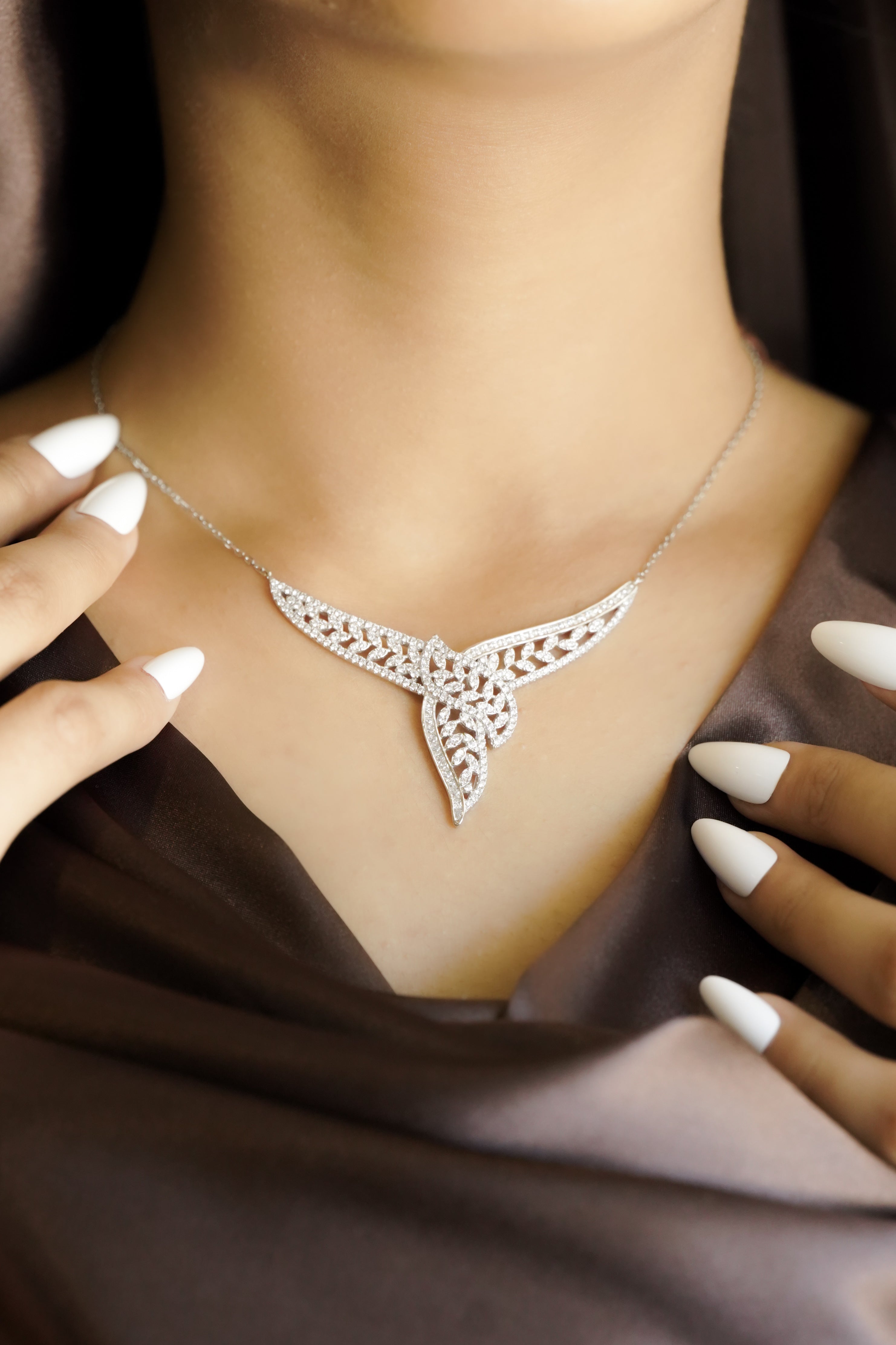 A breathtaking collar necklace featuring an intricate, feather-like design that gracefully drapes the neckline. The piece is fully paved with brilliant Zirconia stones, crafted in 925 Sterling Silver, and guaranteed by the official Kuwait Ministry stamp for certified purity and exceptional luxury.