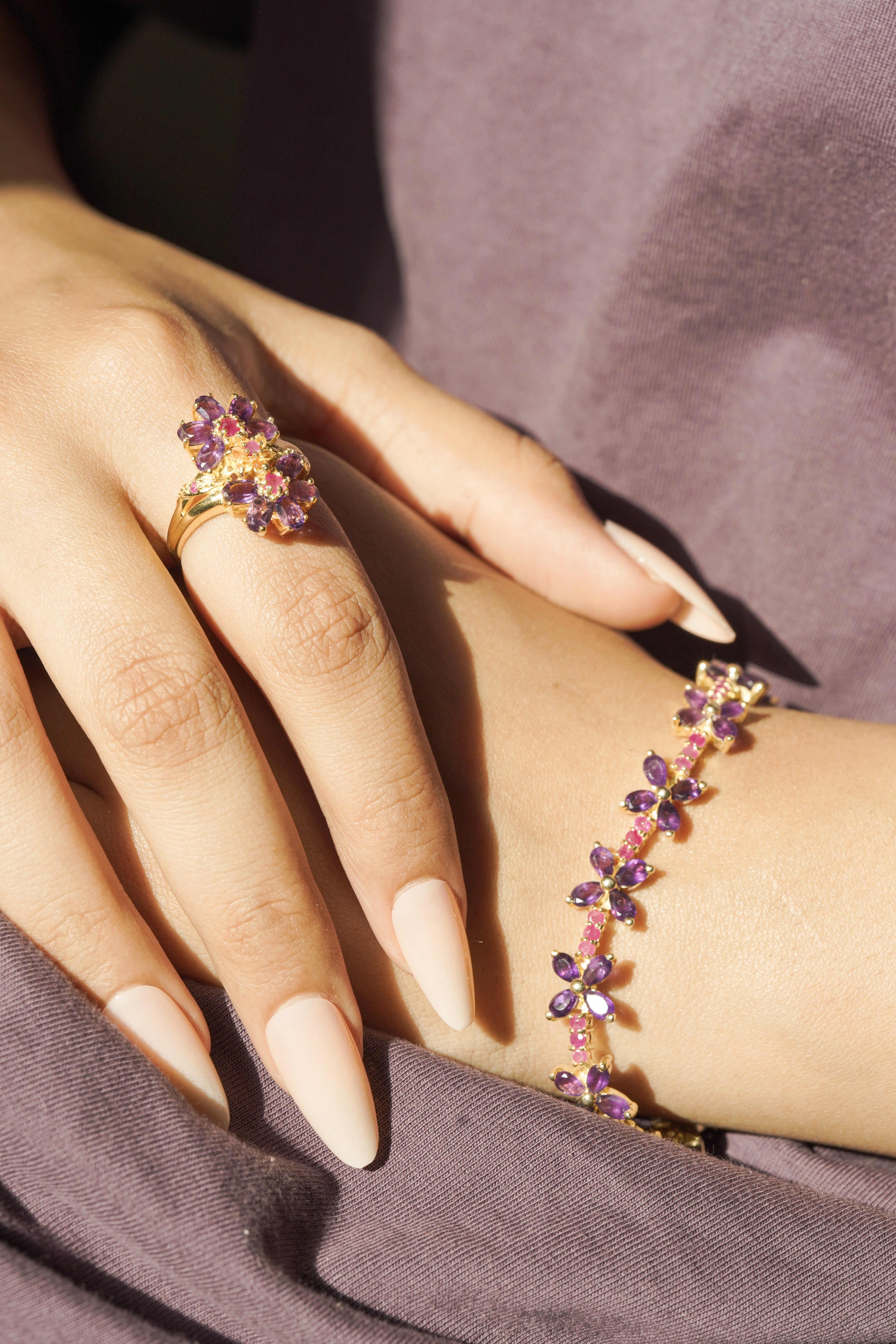 A beautiful matching set featuring floral clusters of marquise-cut Amethyst stones and Pink Zircon accents. Finished with Gold Plating over 925 Sterling Silver and authenticated by the Kuwait Ministry stamp.
