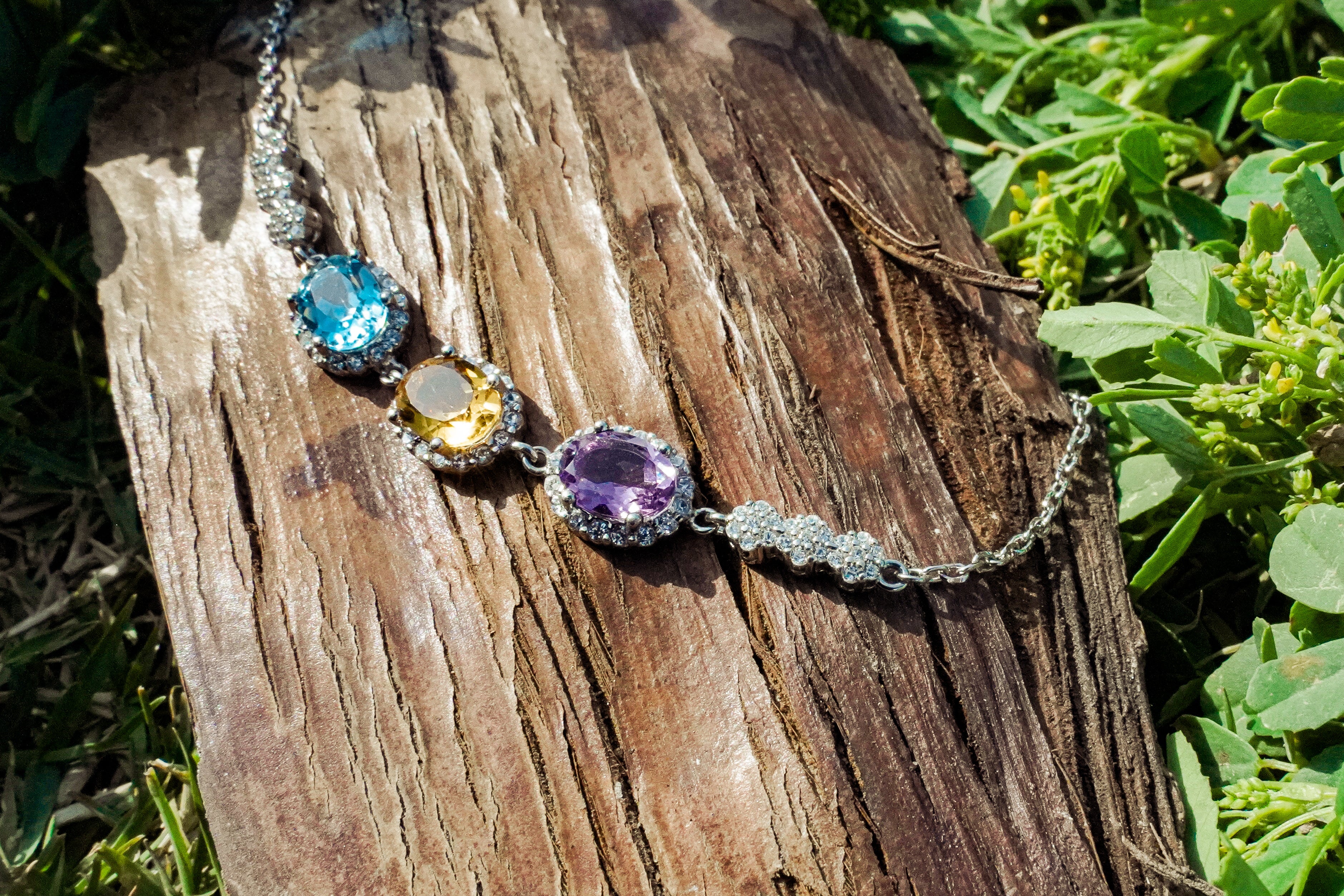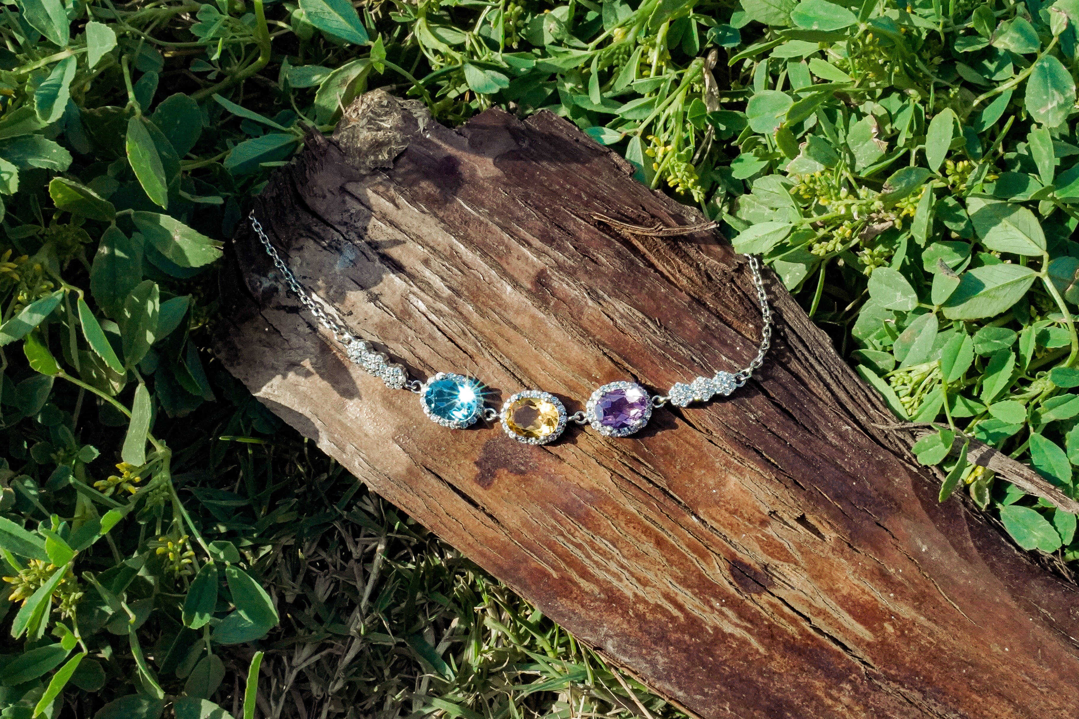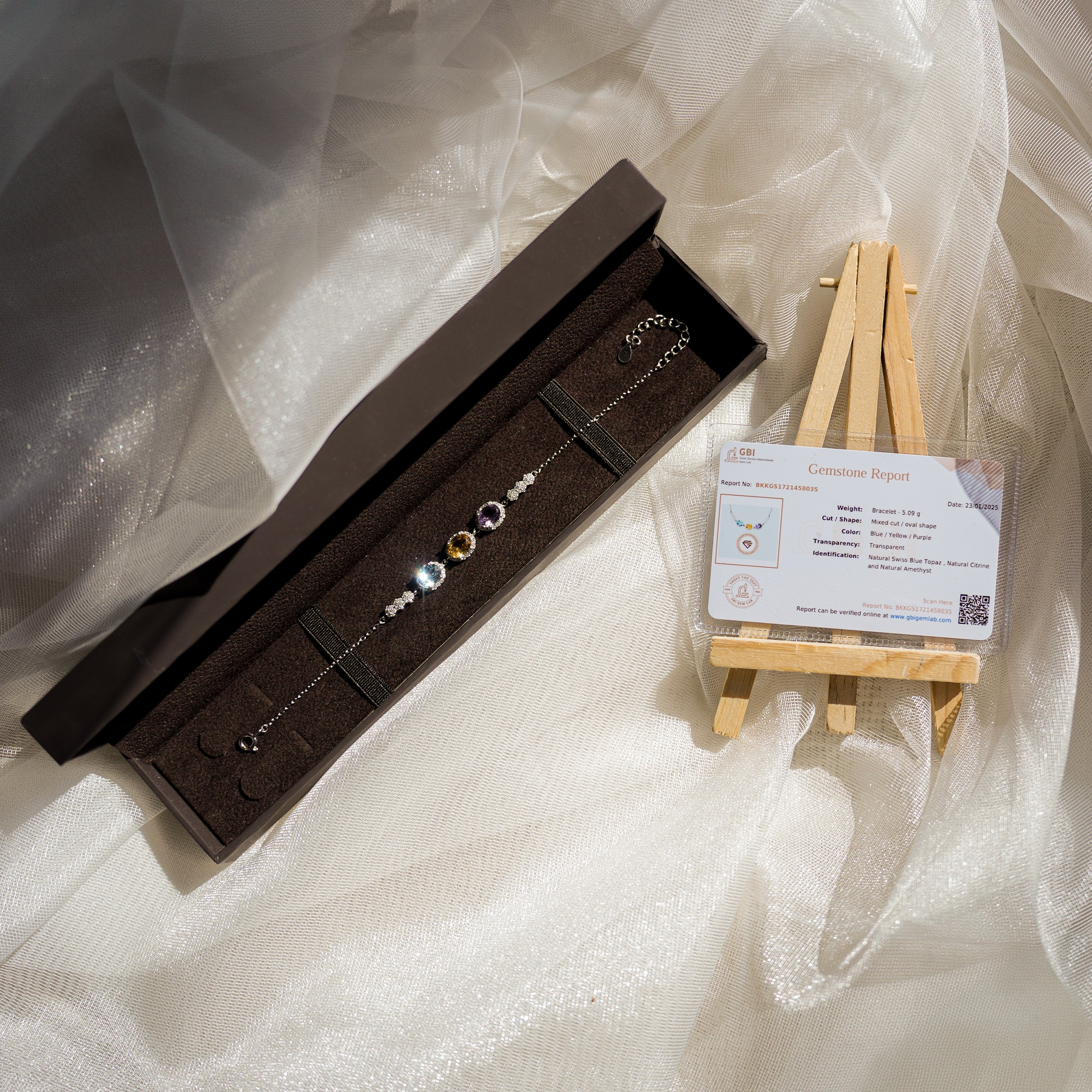 Elegant 925 Sterling Silver Bracelet featuring a trio of certified oval gemstones: Sky Blue Topaz, Citrine, and Amethyst. Kuwait Ministry Stamped