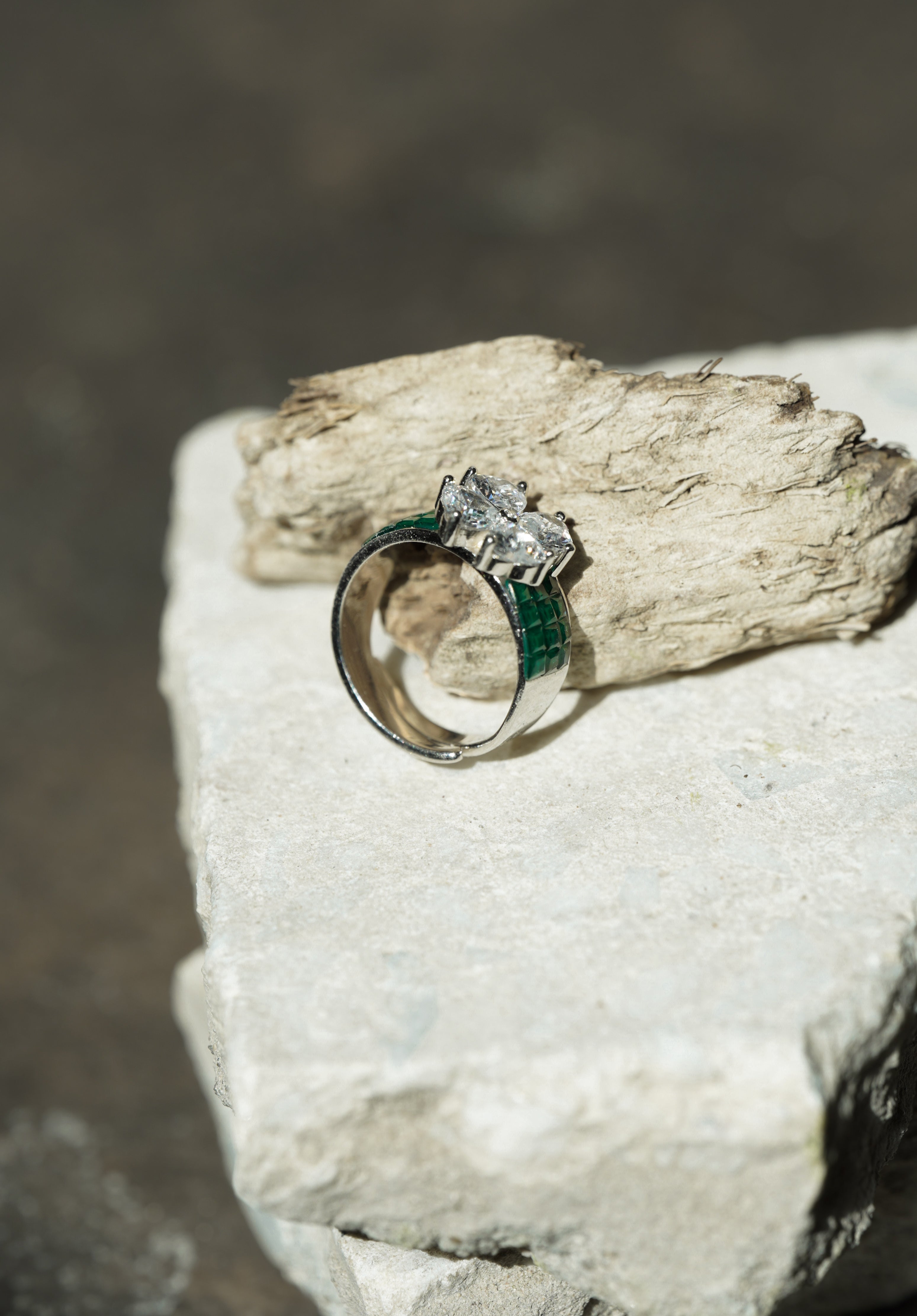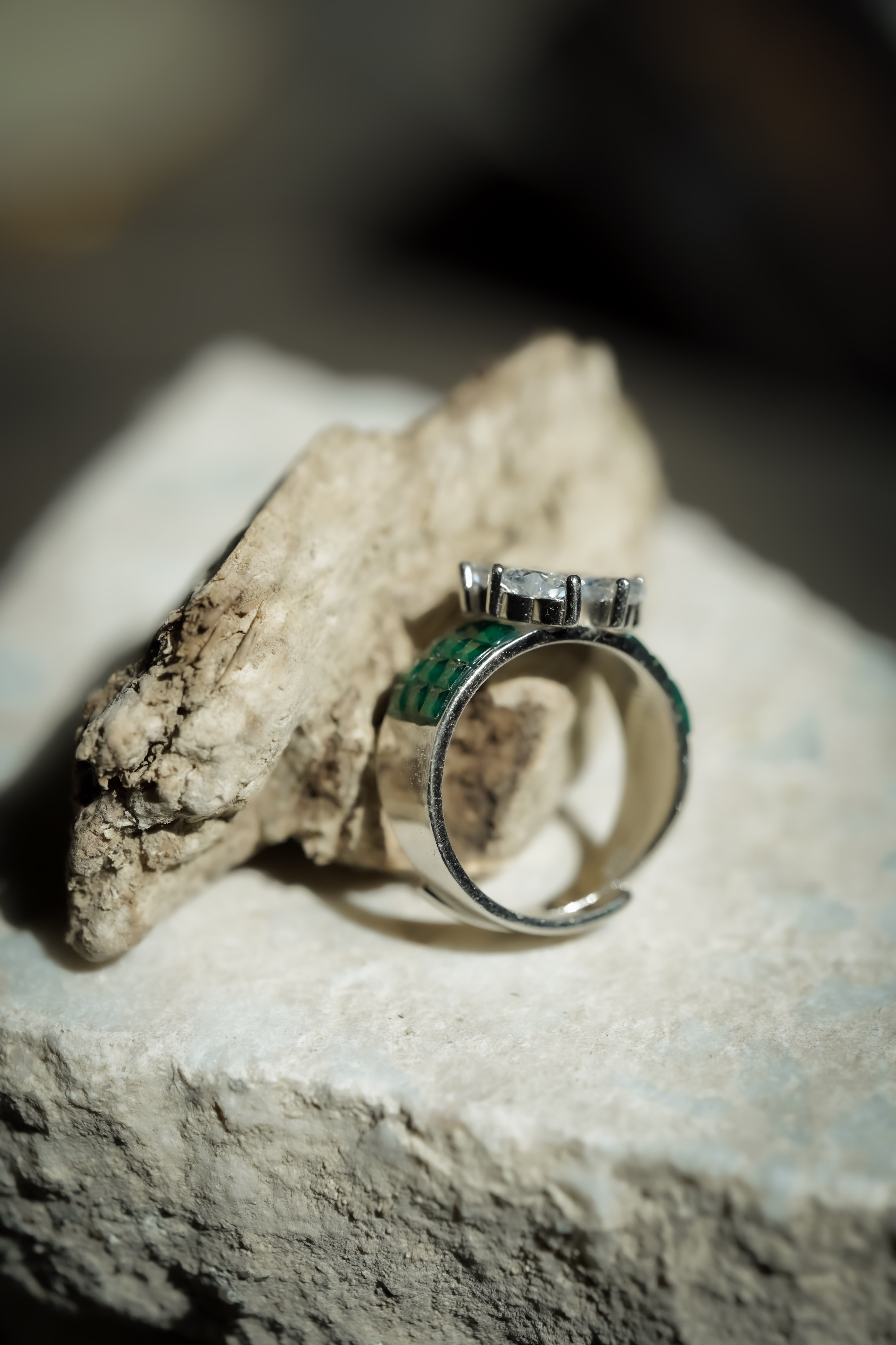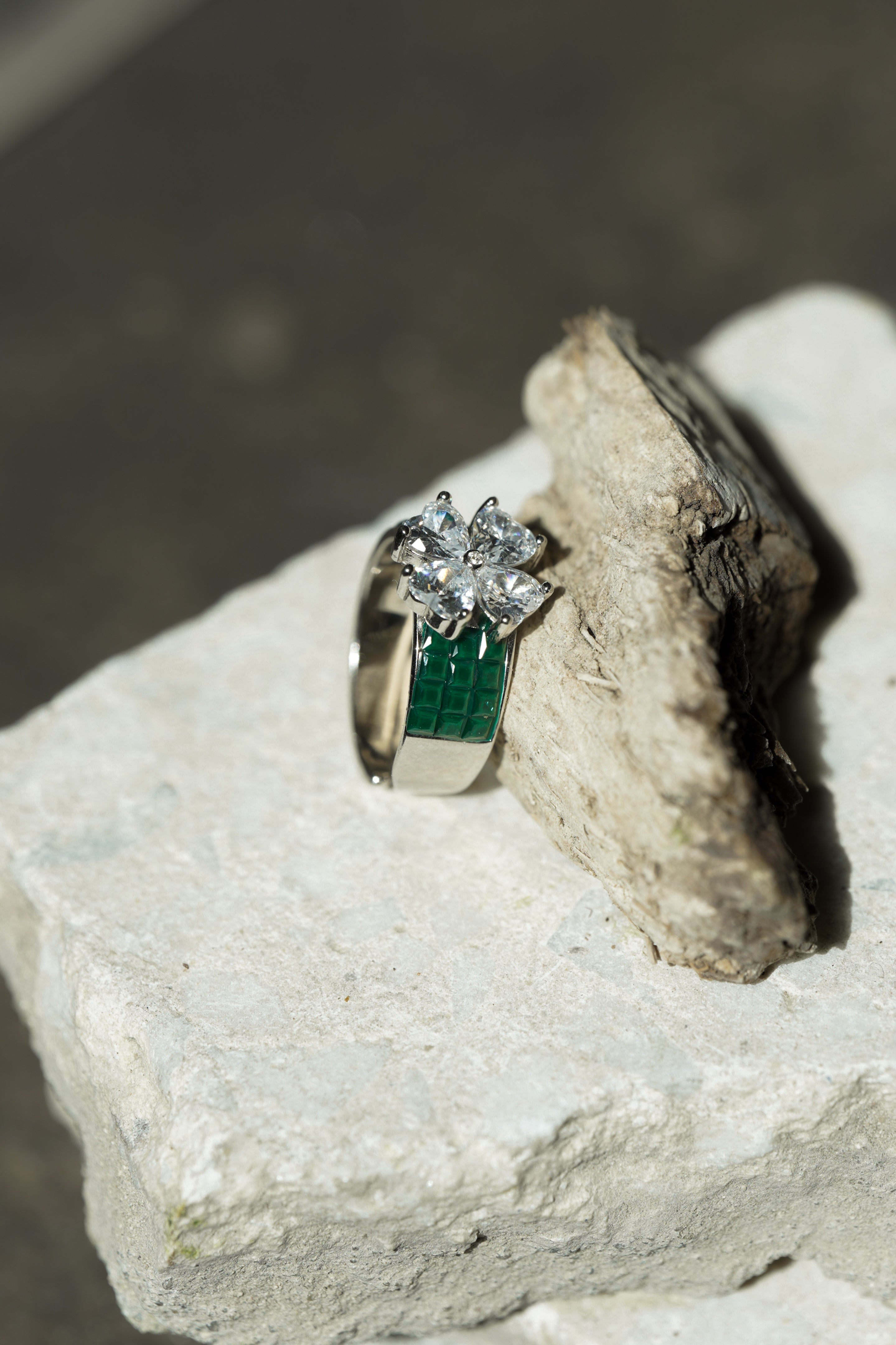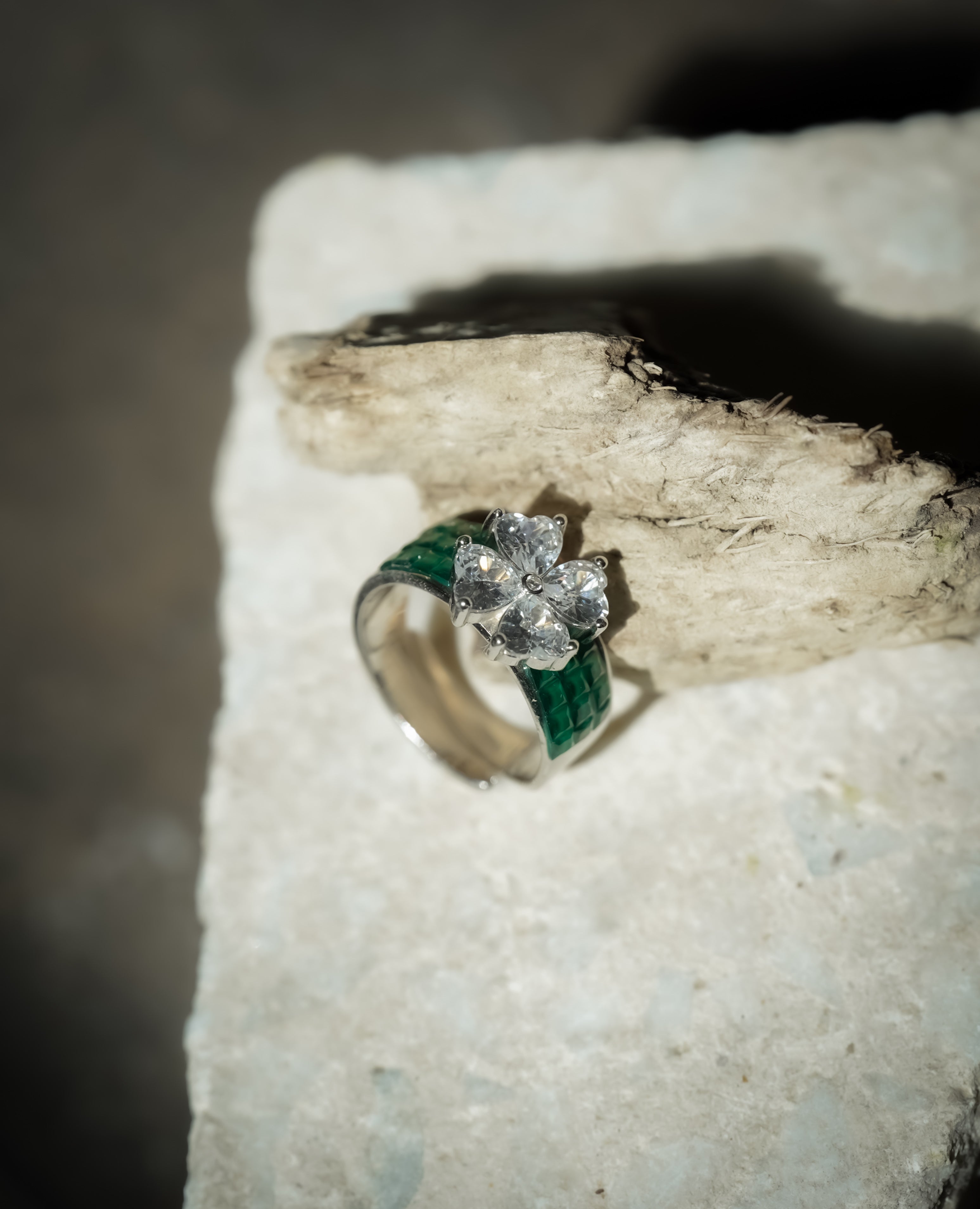 A celestial bloom of brilliant zirconia rests above a band of rich green zircon, flawlessly set in 925 sterling silver. The exquisite invisible setting and official Ministry stamp ensure a piece of enduring, captivating luxury.