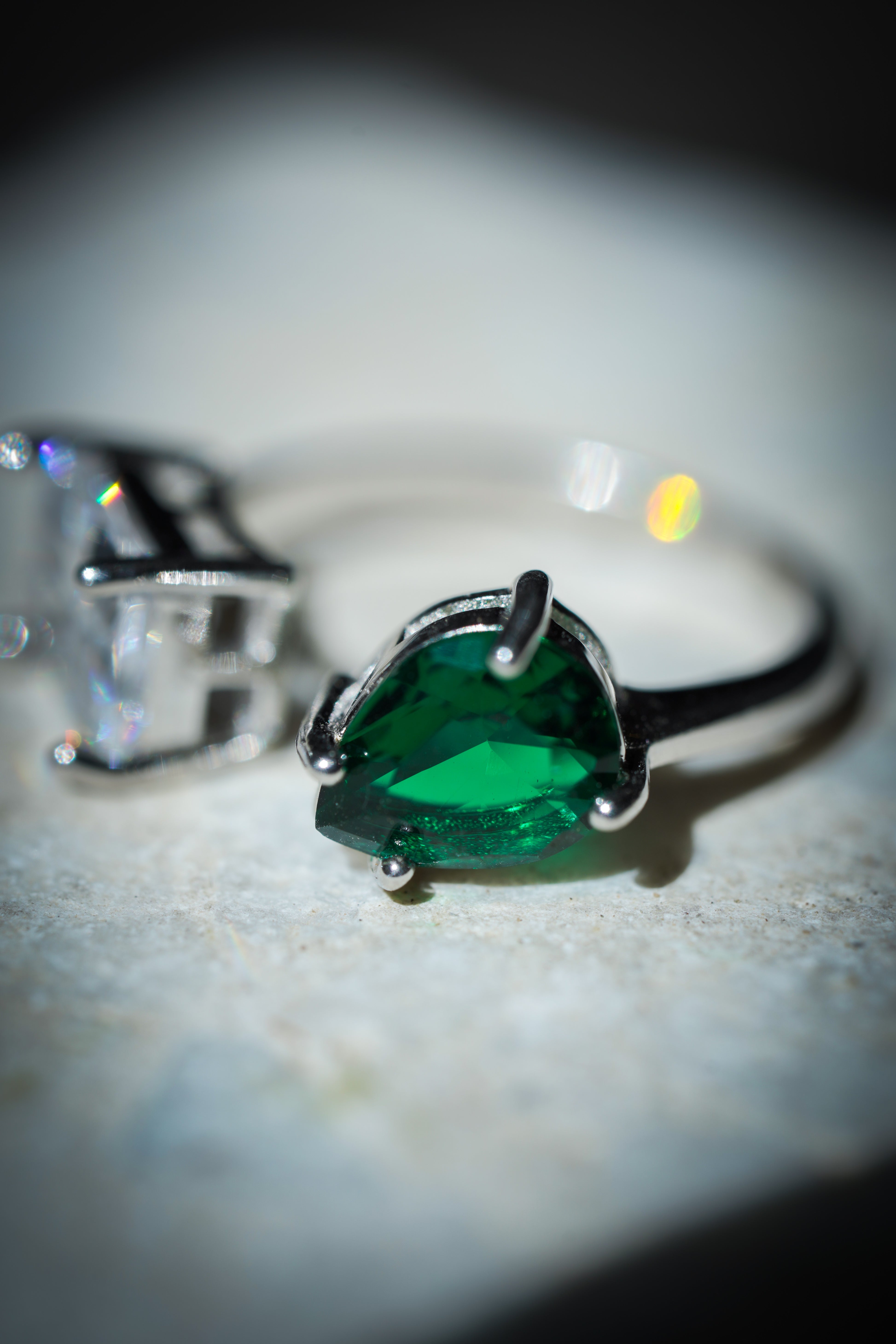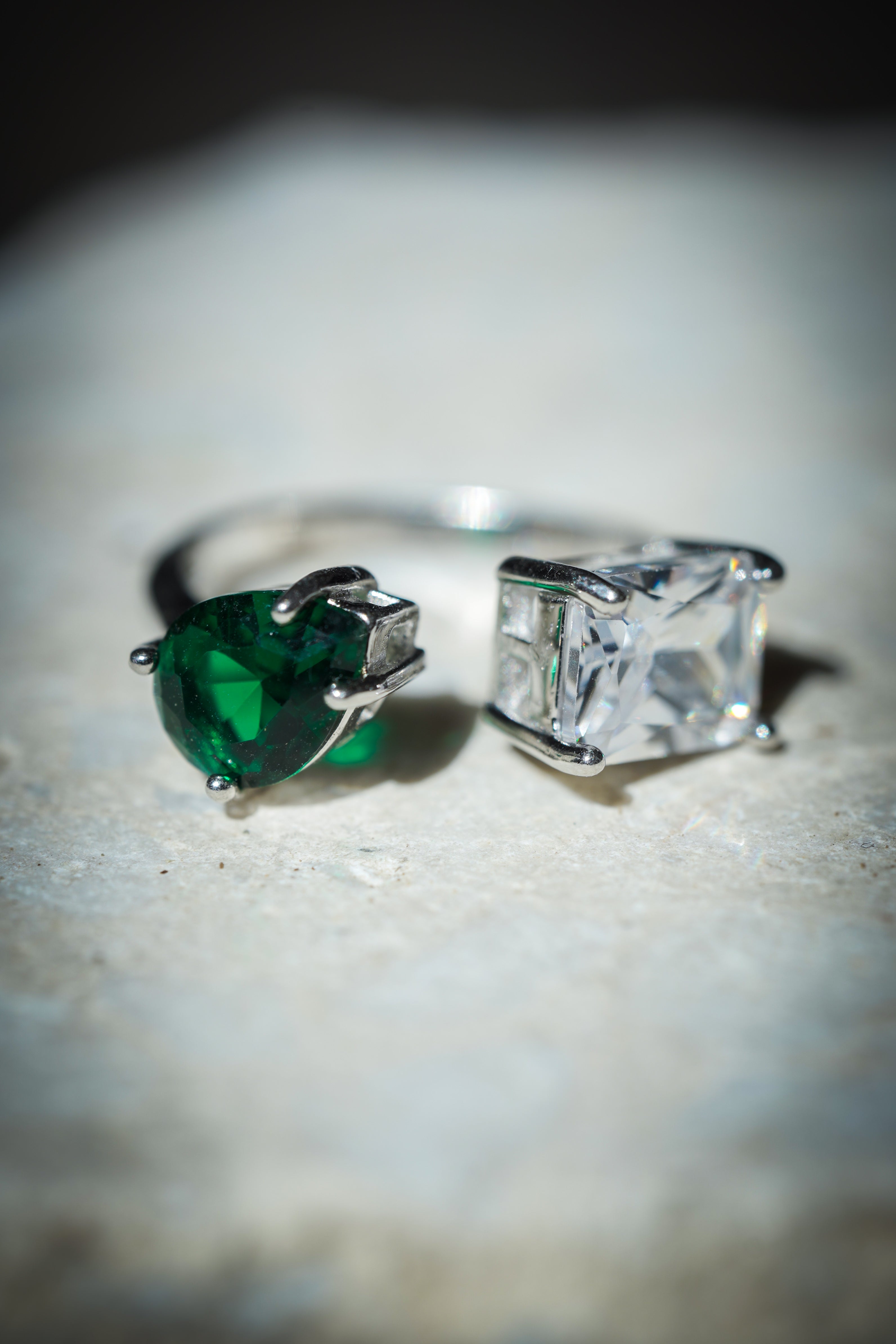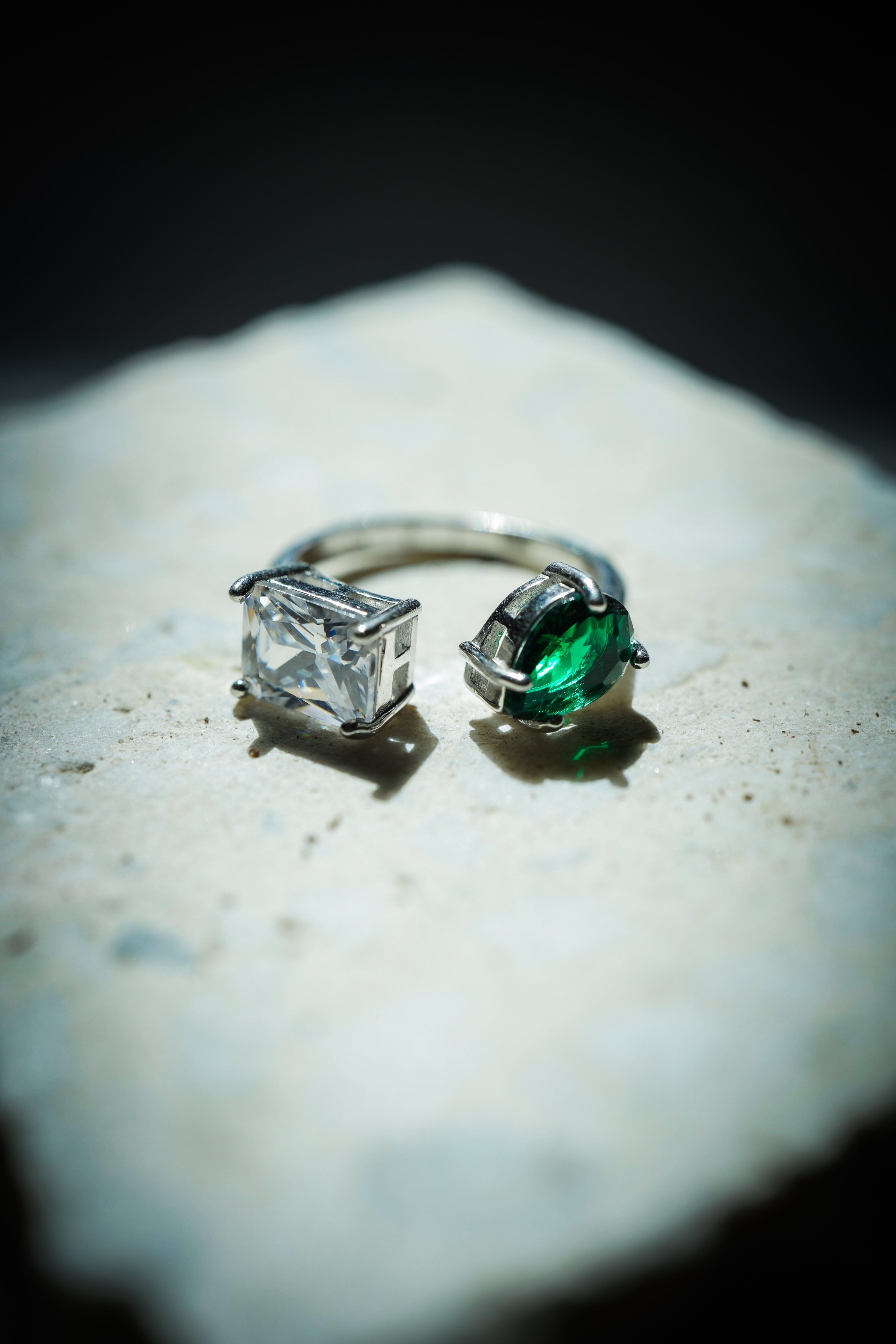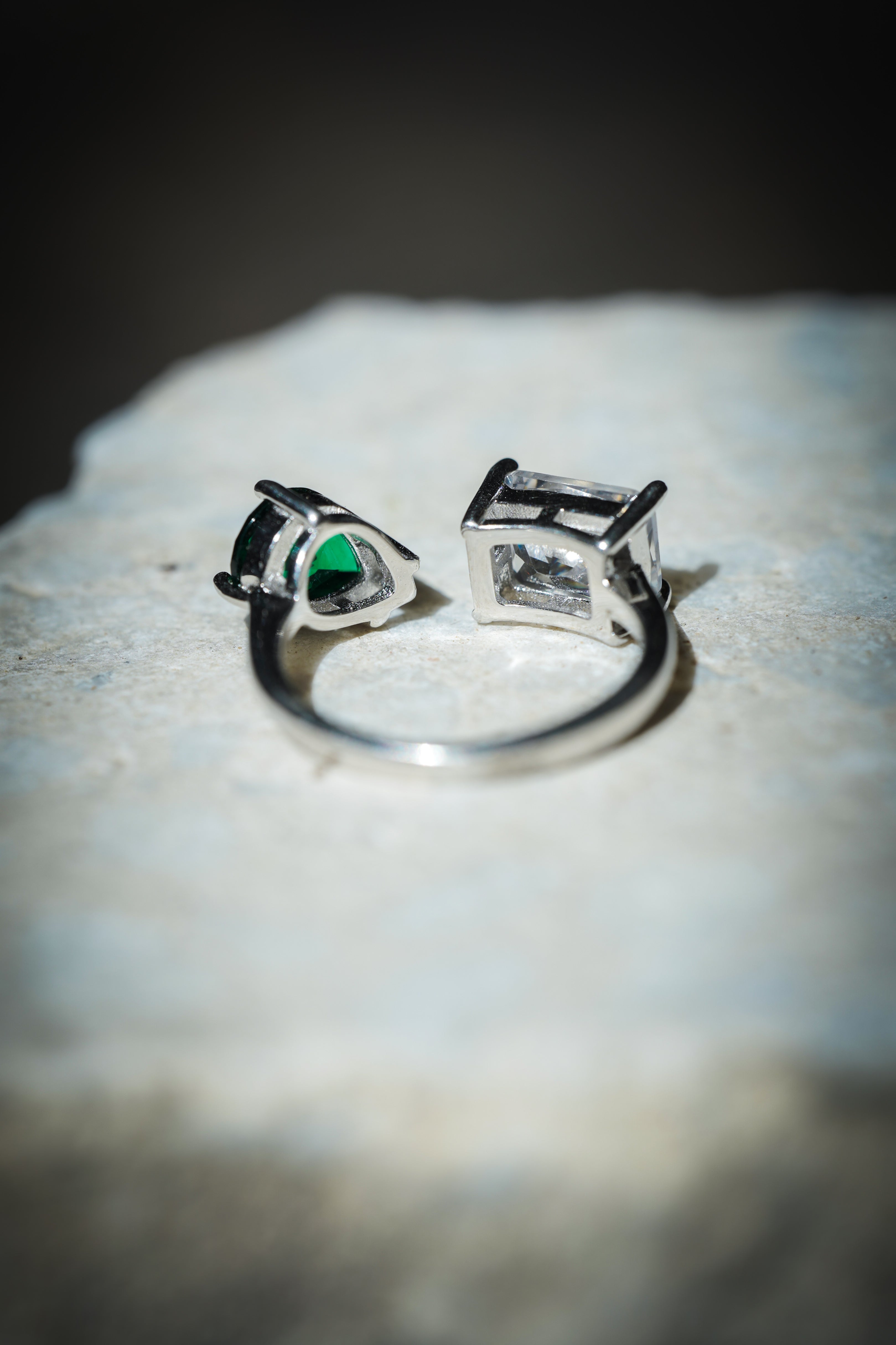 Chic two-stone bypass ring in 925 Sterling Silver, featuring a clear rectangular Zirconia and a vibrant Green Semi-Precious Emerald. Kuwait Ministry Stamped.