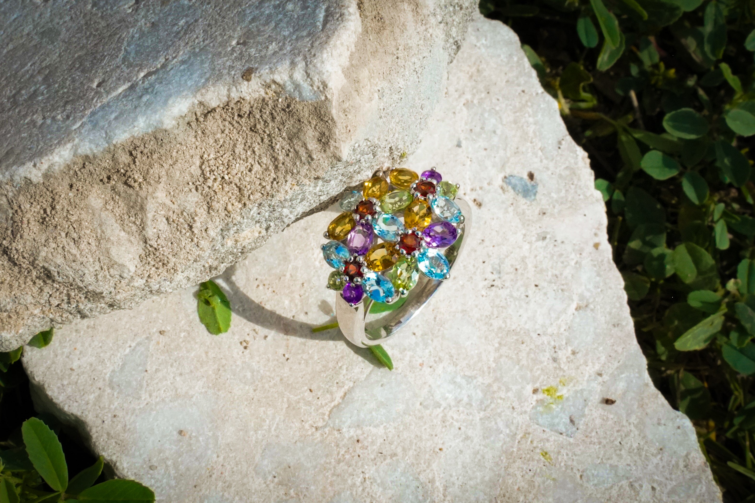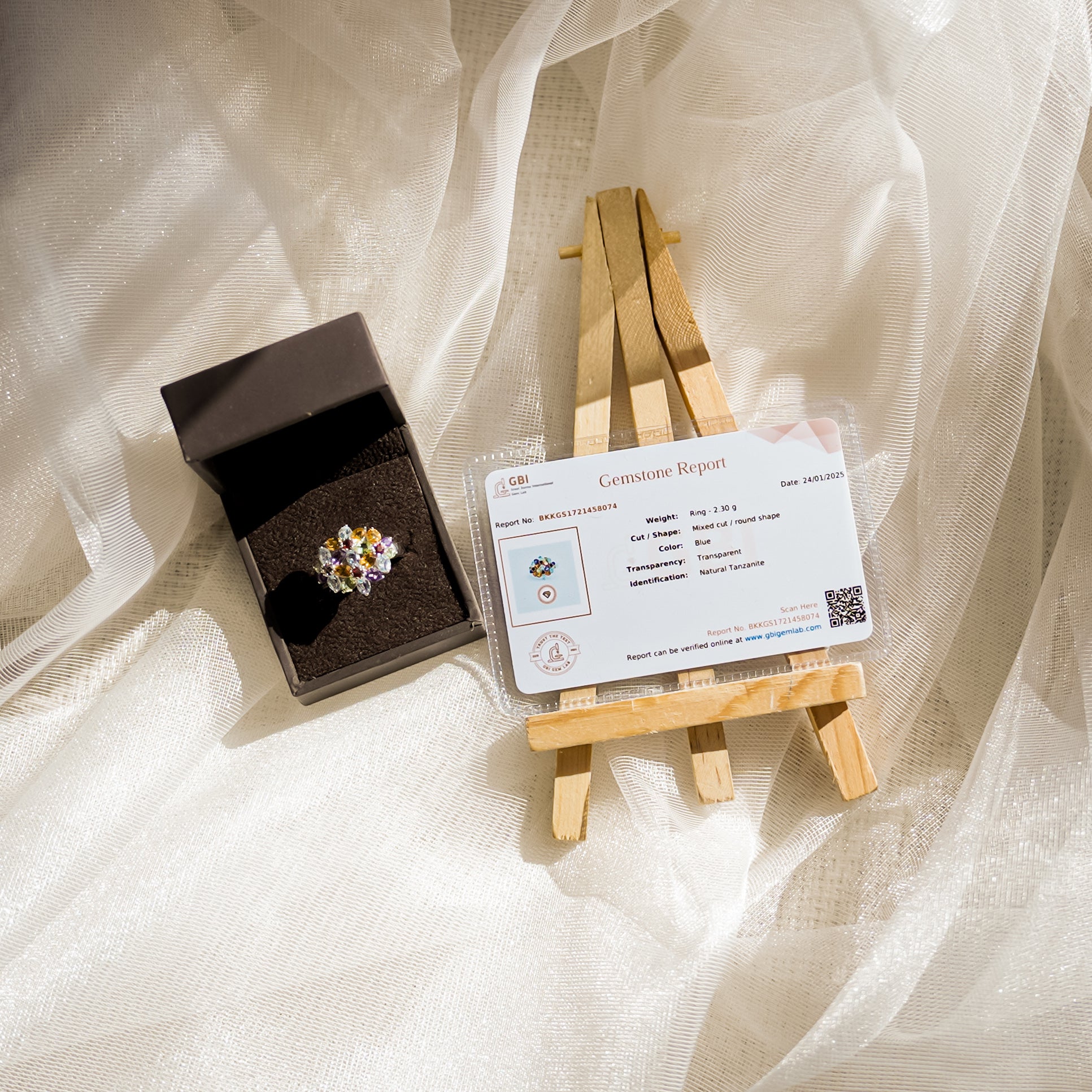 Statement 925 Sterling Silver ring featuring Certified Tanzanite and other vivid colored stones in a beautiful cluster. Kuwait Ministry Stamped.