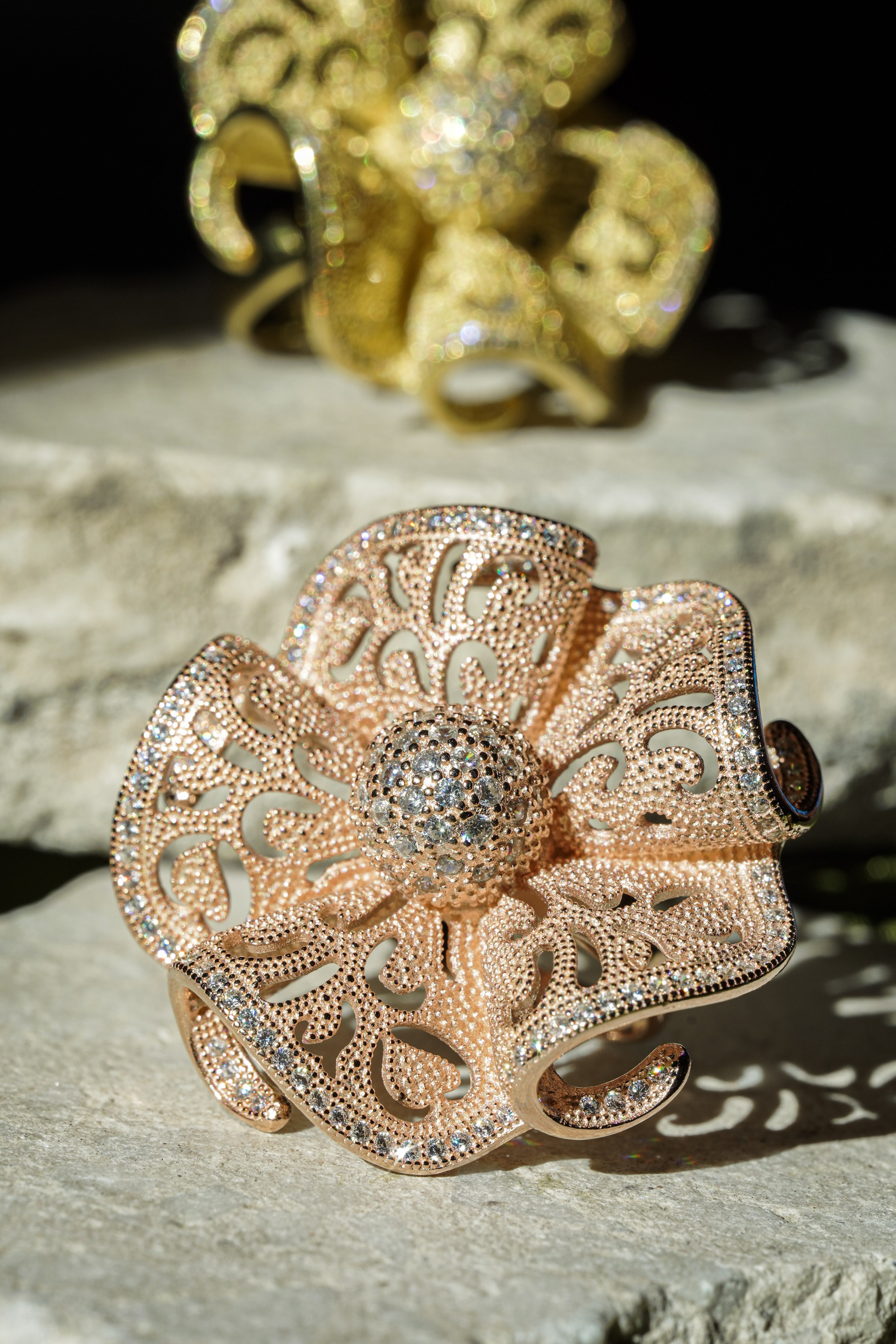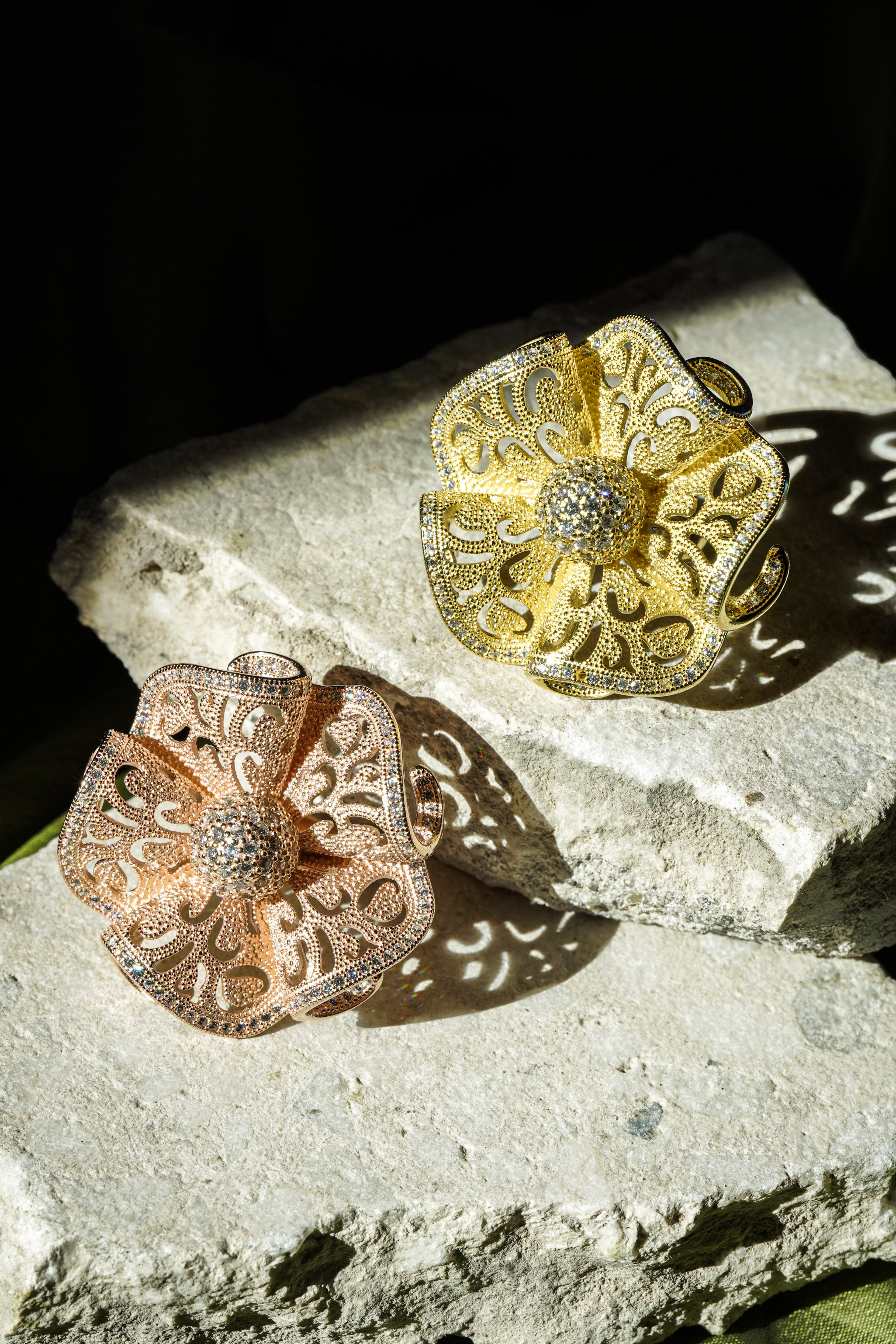 Stunning Rose Gold Plated flower ring featuring filigree and Zirconia. Certified 925 Sterling Silver with the official Kuwait Ministry stamp.