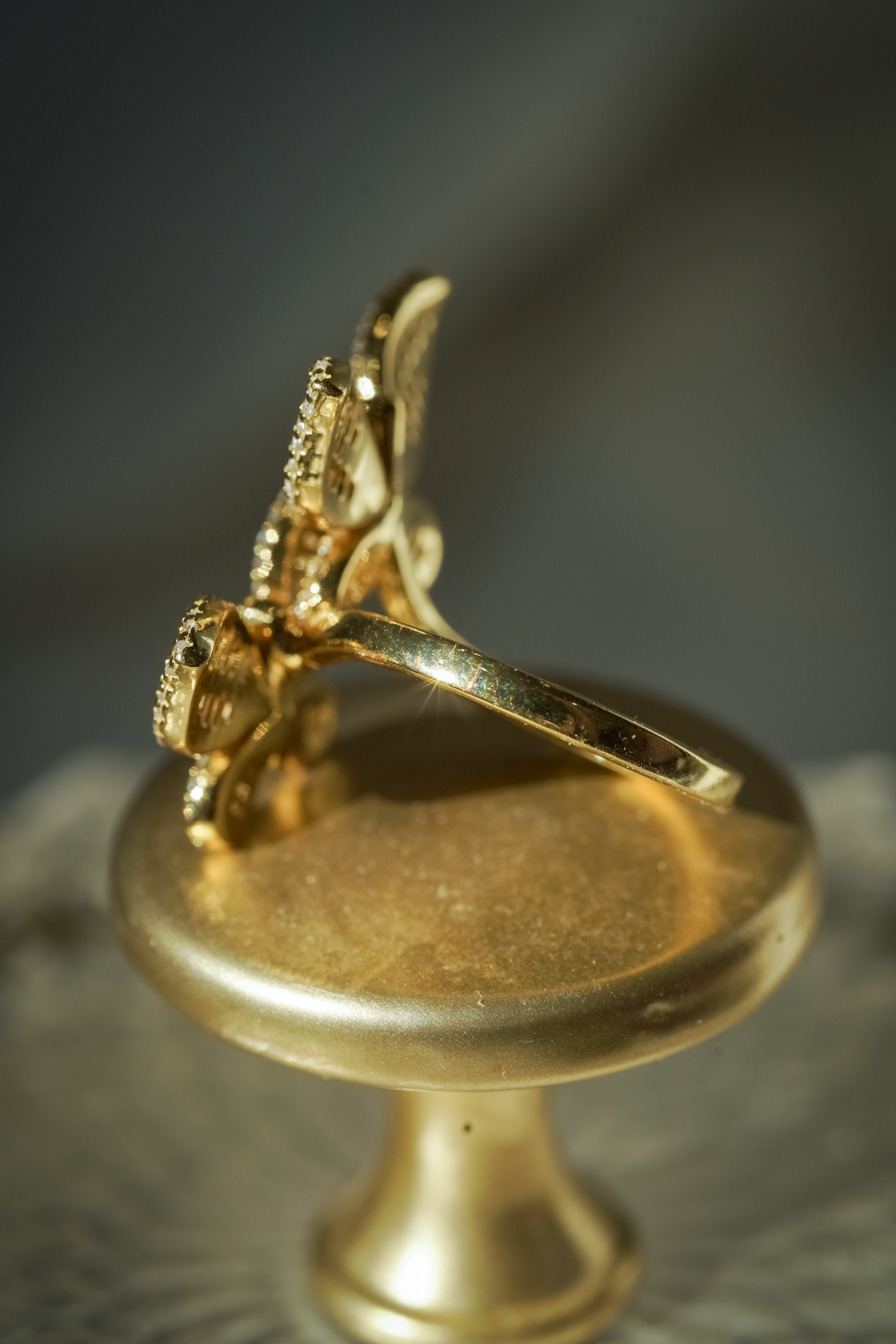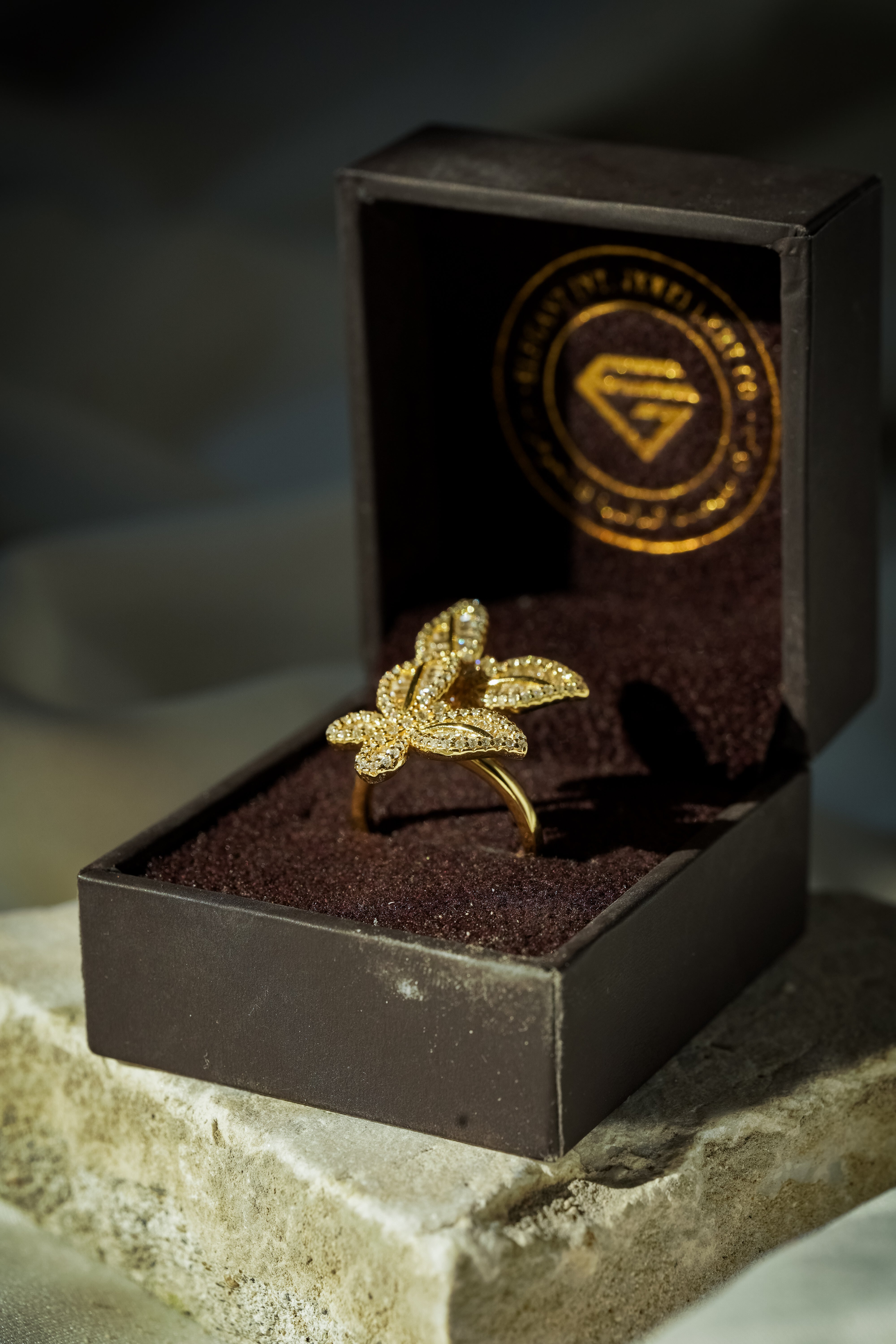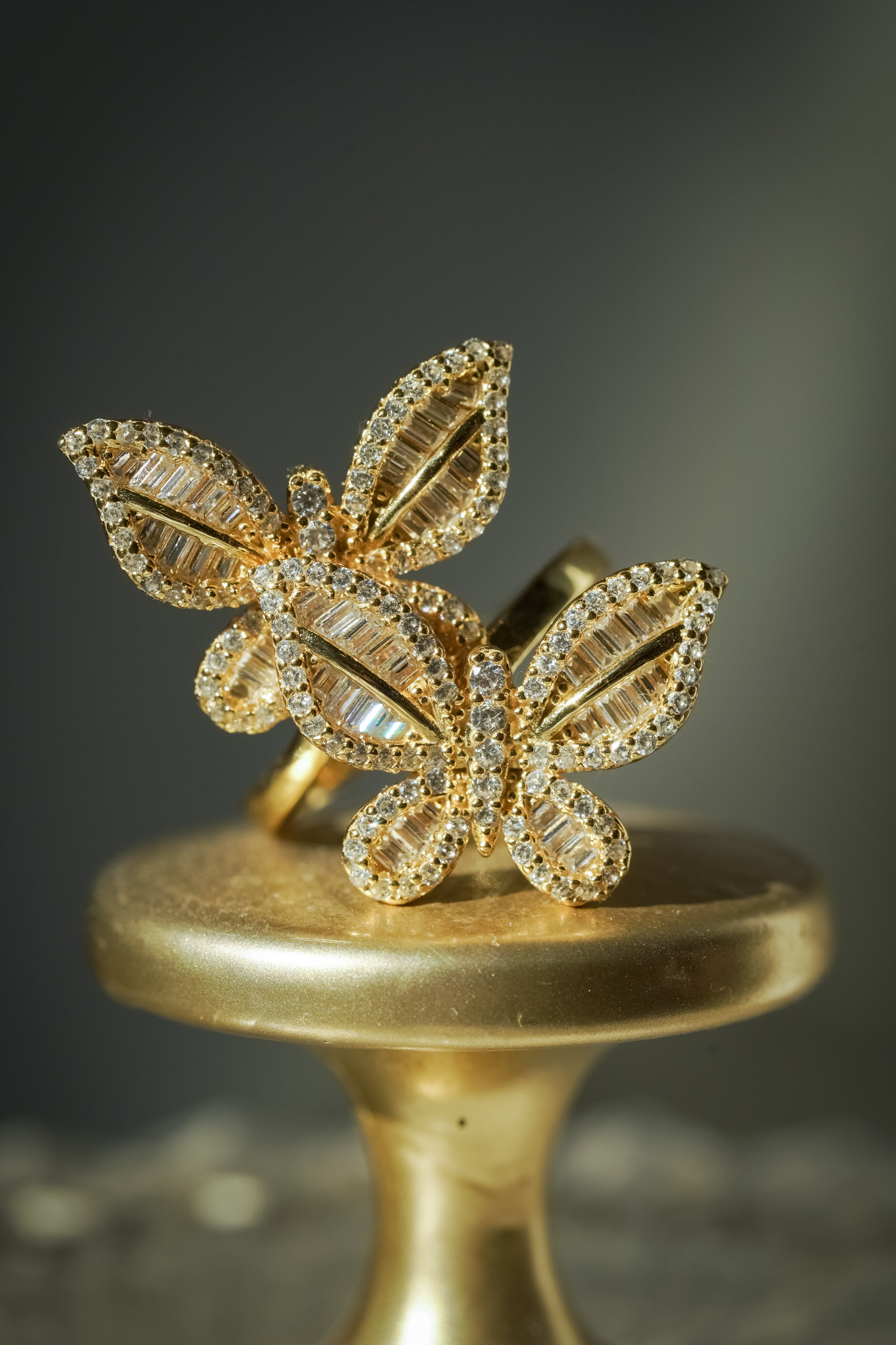 A delicate, sculptural ring featuring a butterfly or leafy design, fully paved with brilliant Zirconia stones. Finished with rich Gold Plating over fine 925 Sterling Silver and authenticated by the Kuwait Ministry stamp.