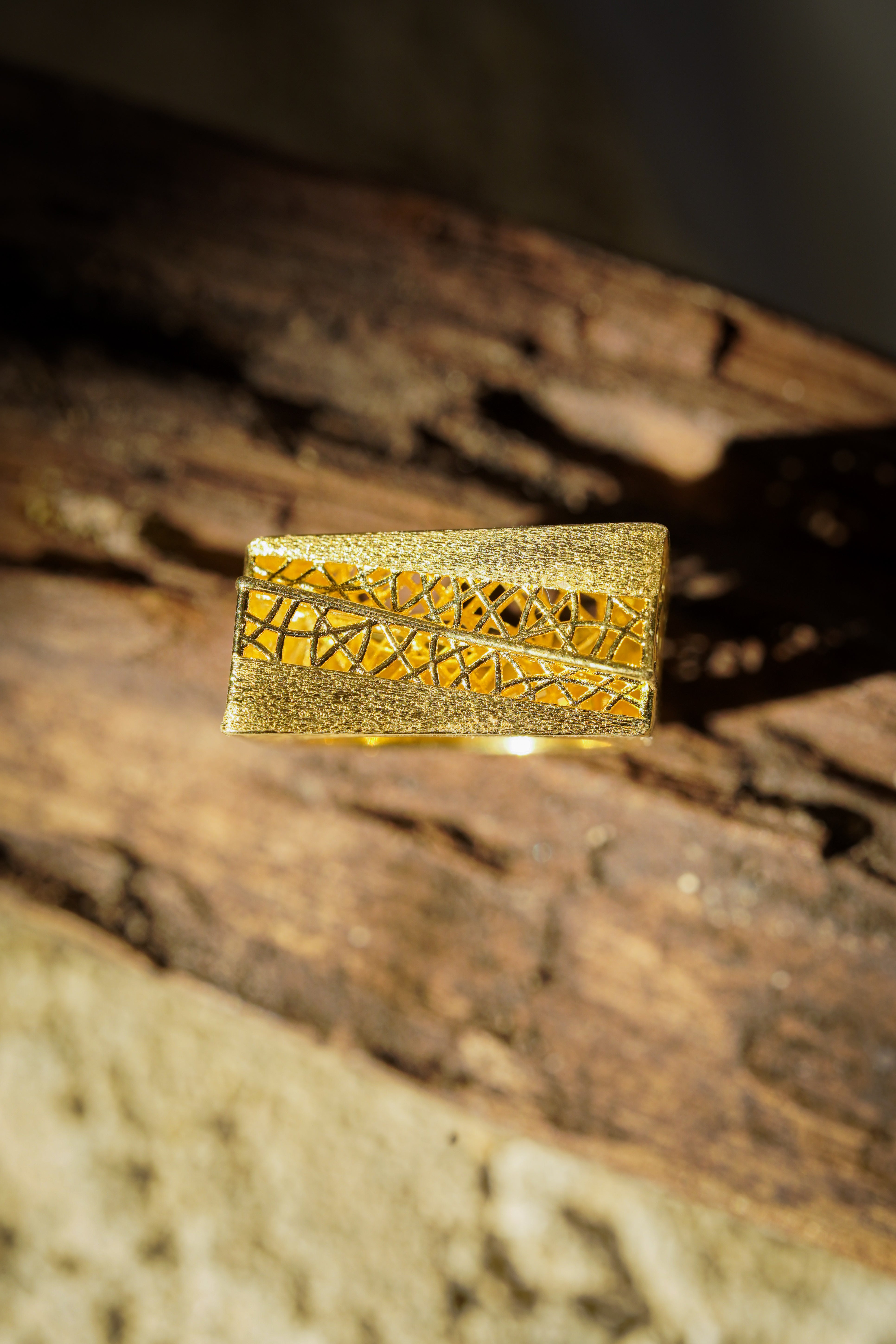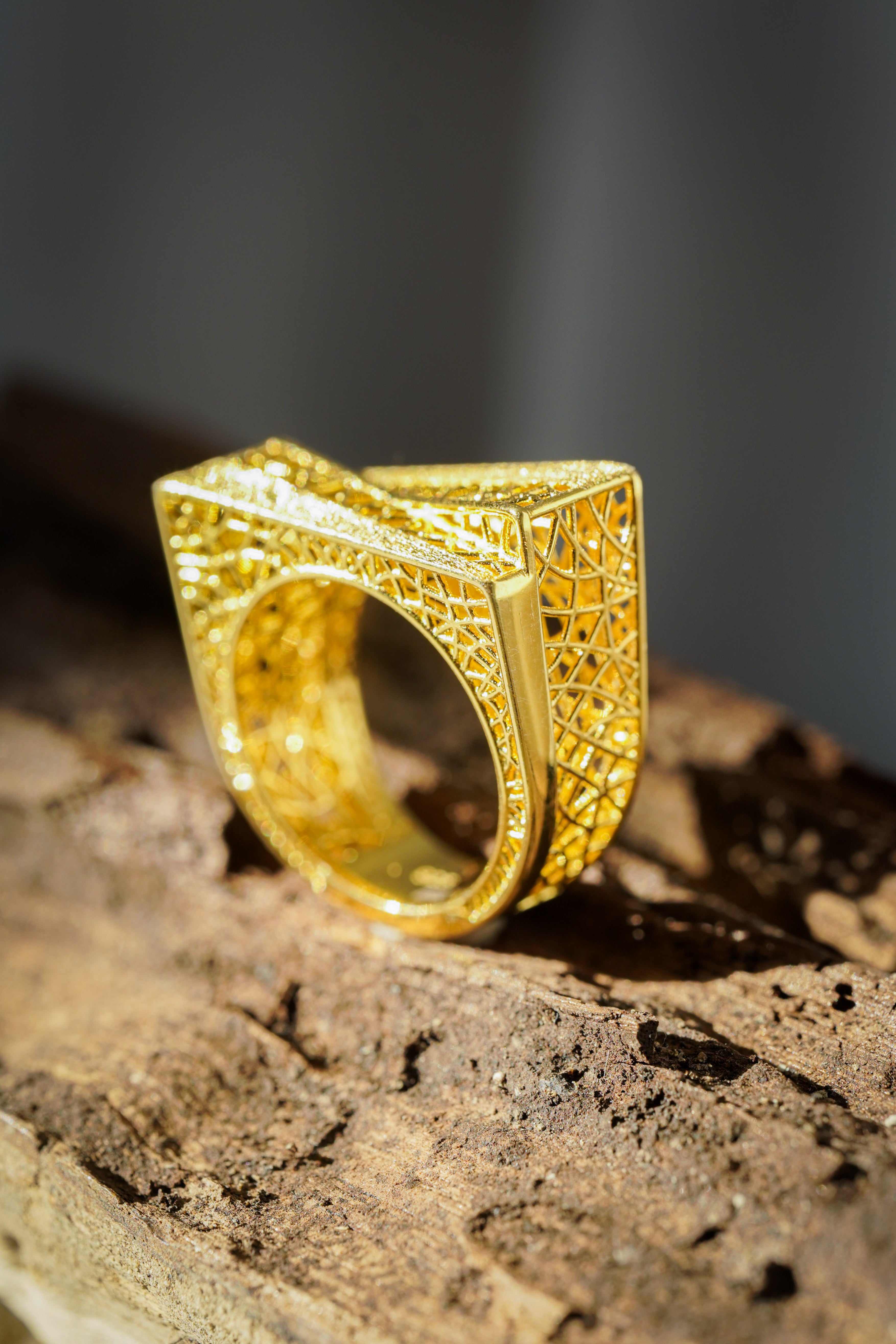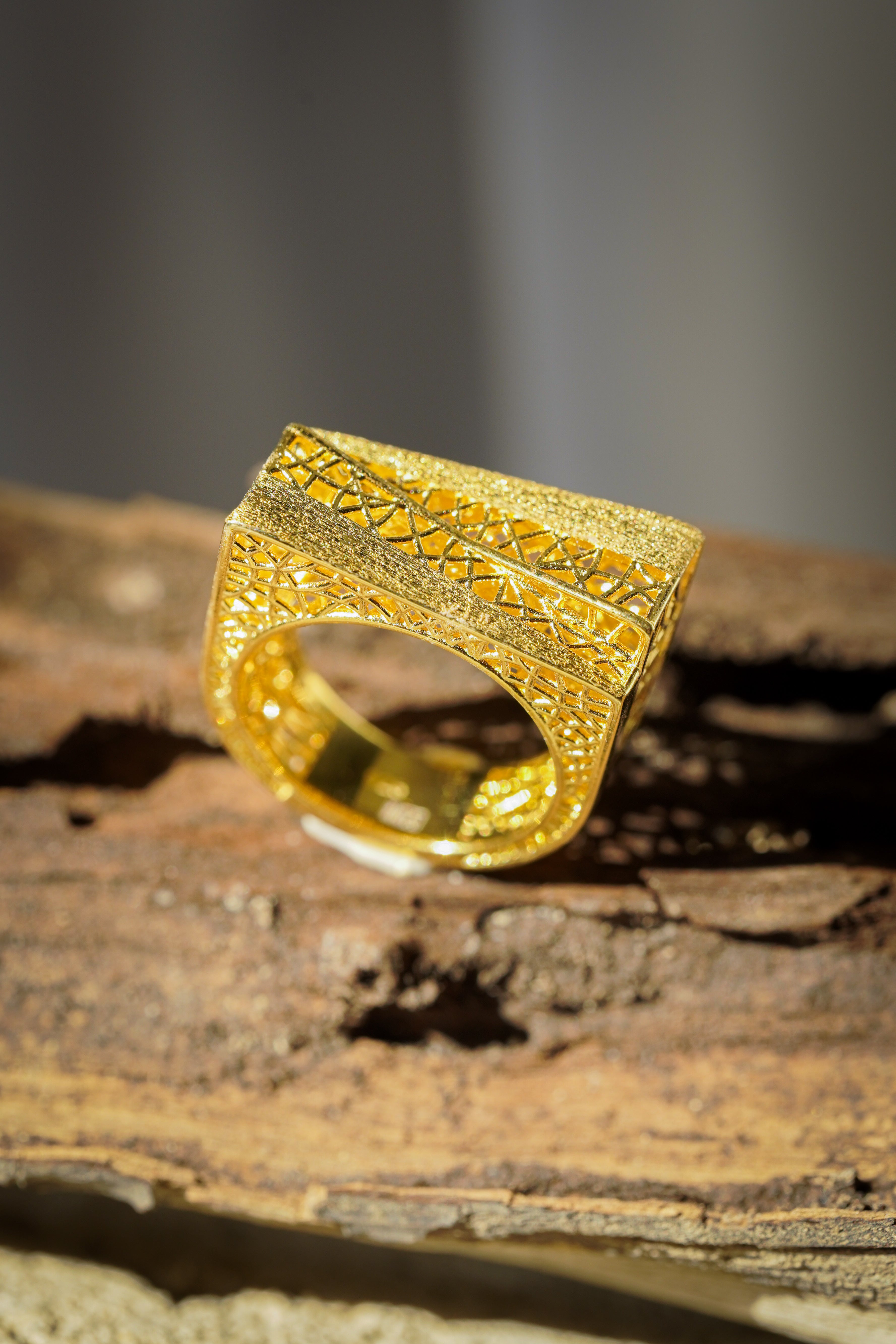 A bold statement ring featuring an intricate Turkish Design lattice motif in a large, geometric square shape. Finished with rich Gold Plating over fine 925 Sterling Silver and authenticated by the official Kuwait Ministry stamp.