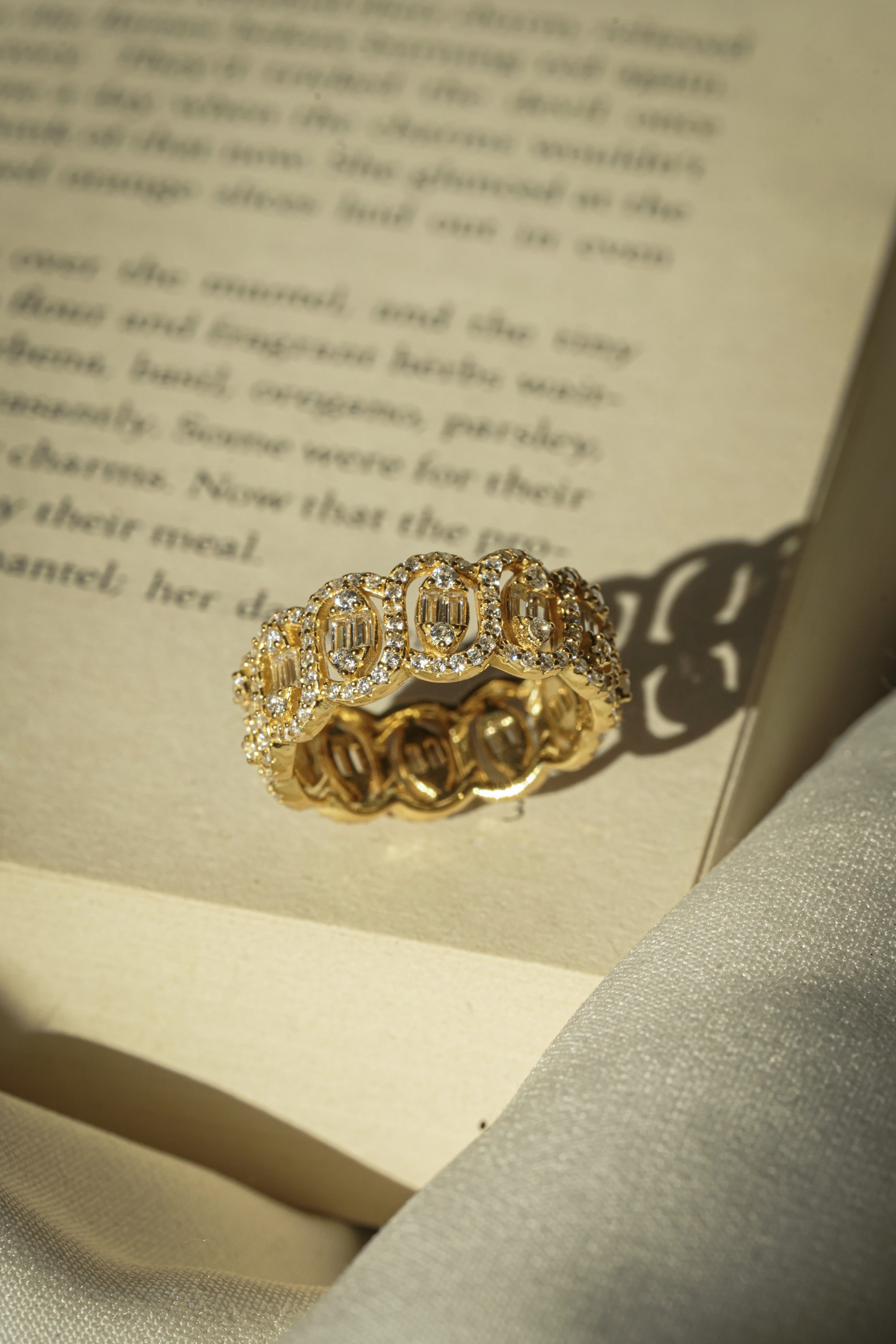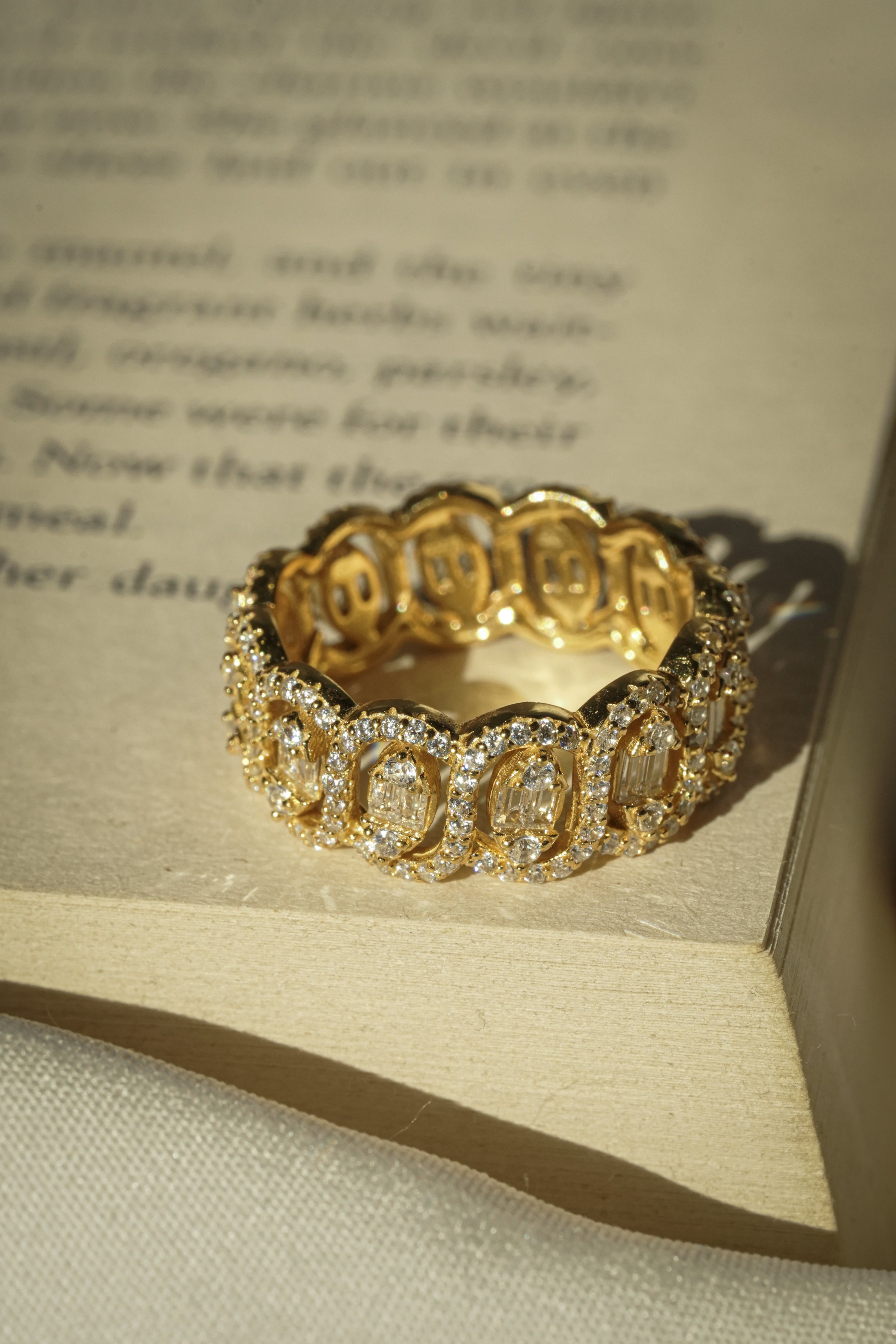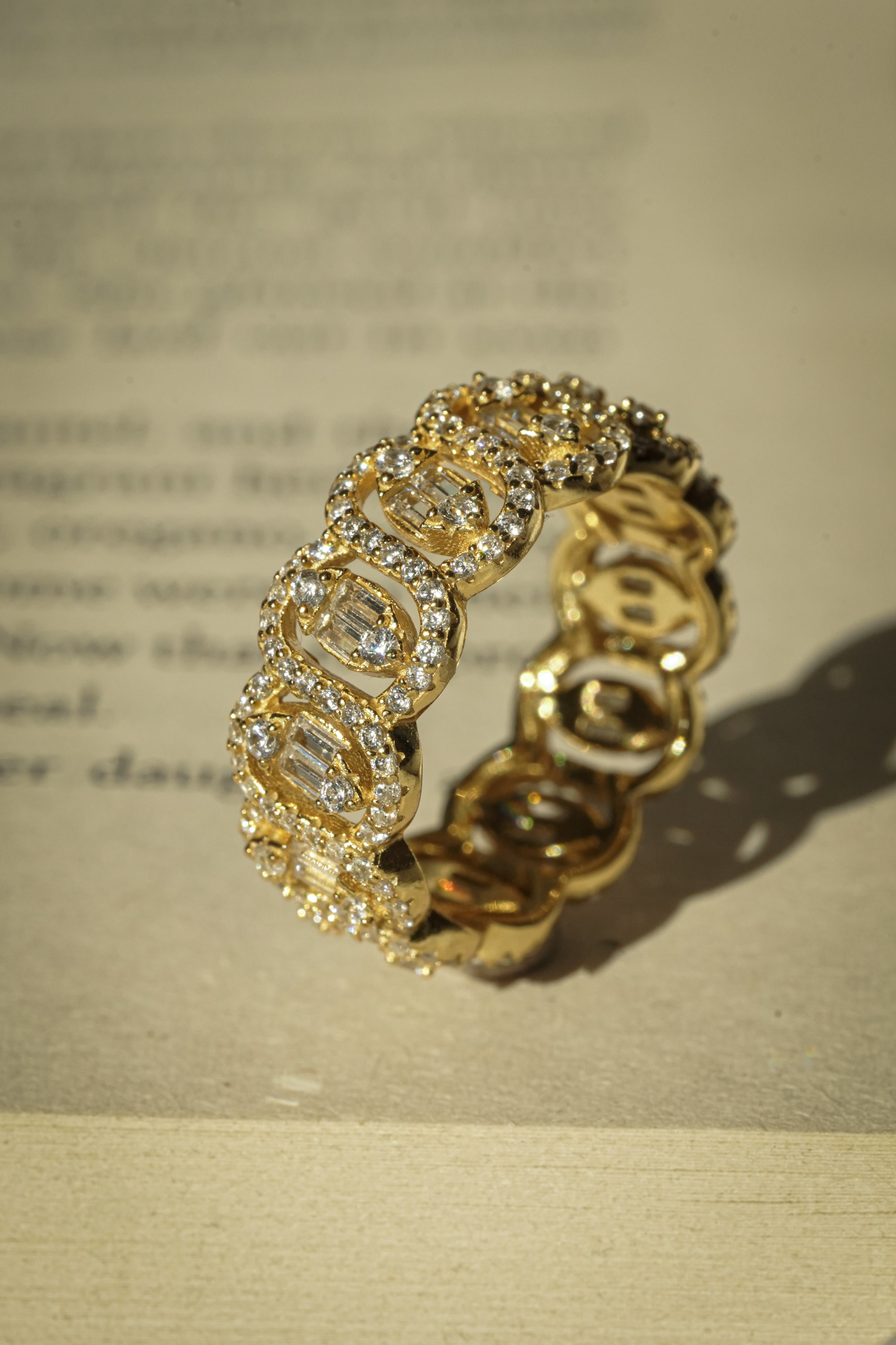 A bold, luxurious eternity band featuring alternating Zirconia shapes set in rich Gold Plating. Crafted from fine 925 Sterling Silver and authenticated by the official Kuwait Ministry stamp.
