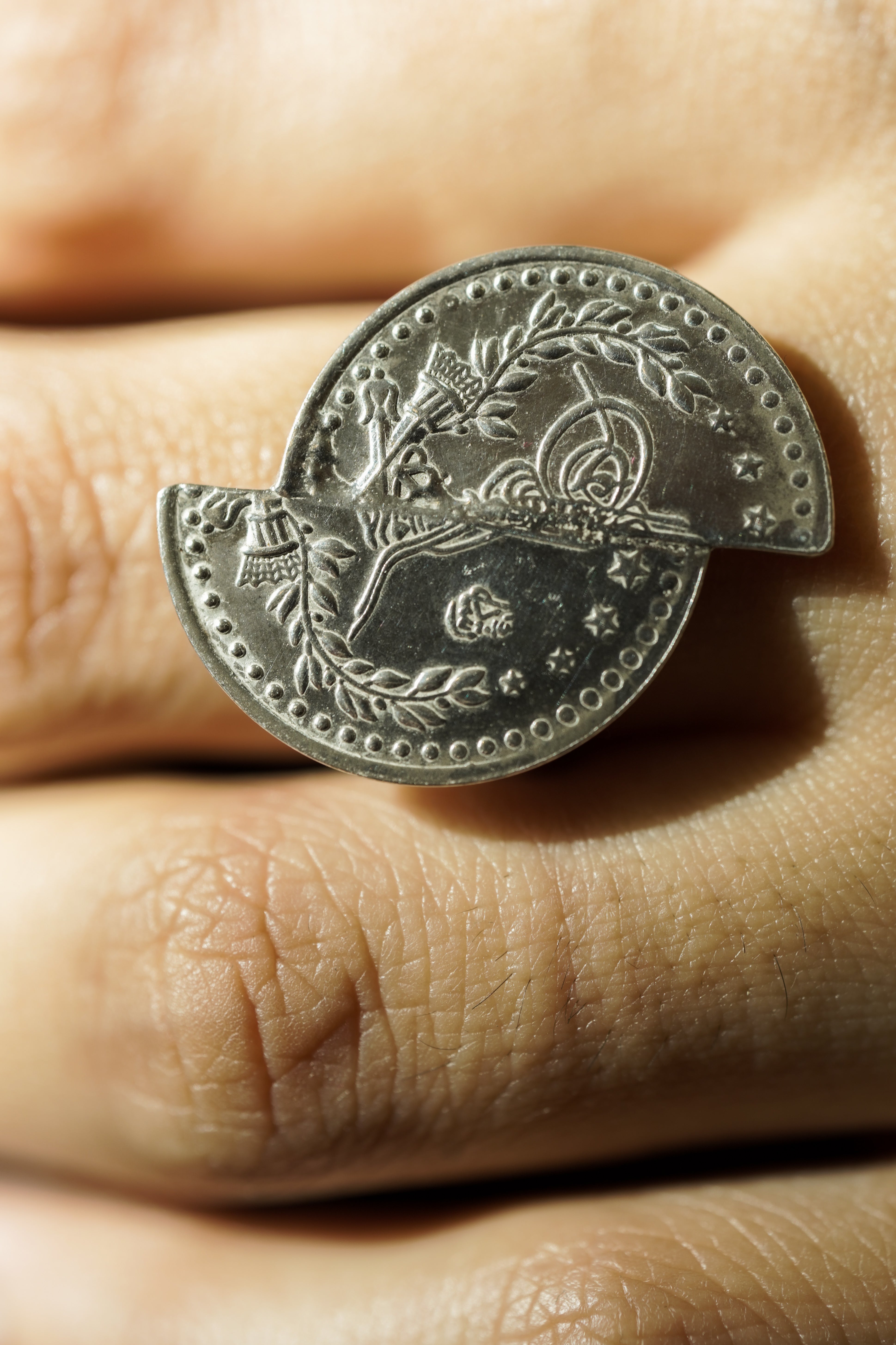 A striking statement ring featuring a unique Arabic Design coin motif split across the finger. Crafted in polished 925 Sterling Silver and authenticated with the official Kuwait Ministry stamp, guaranteeing certified purity and historical elegance.