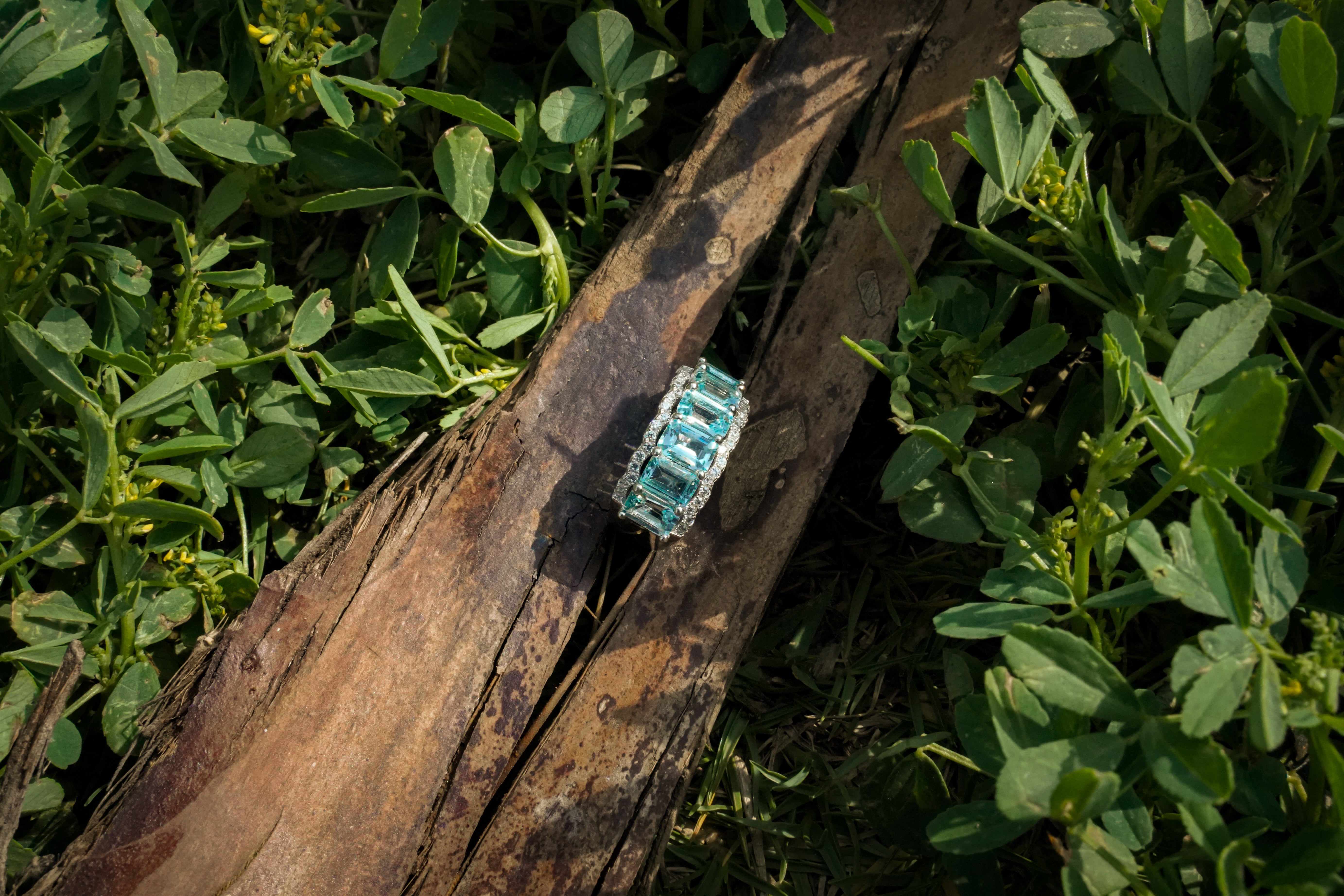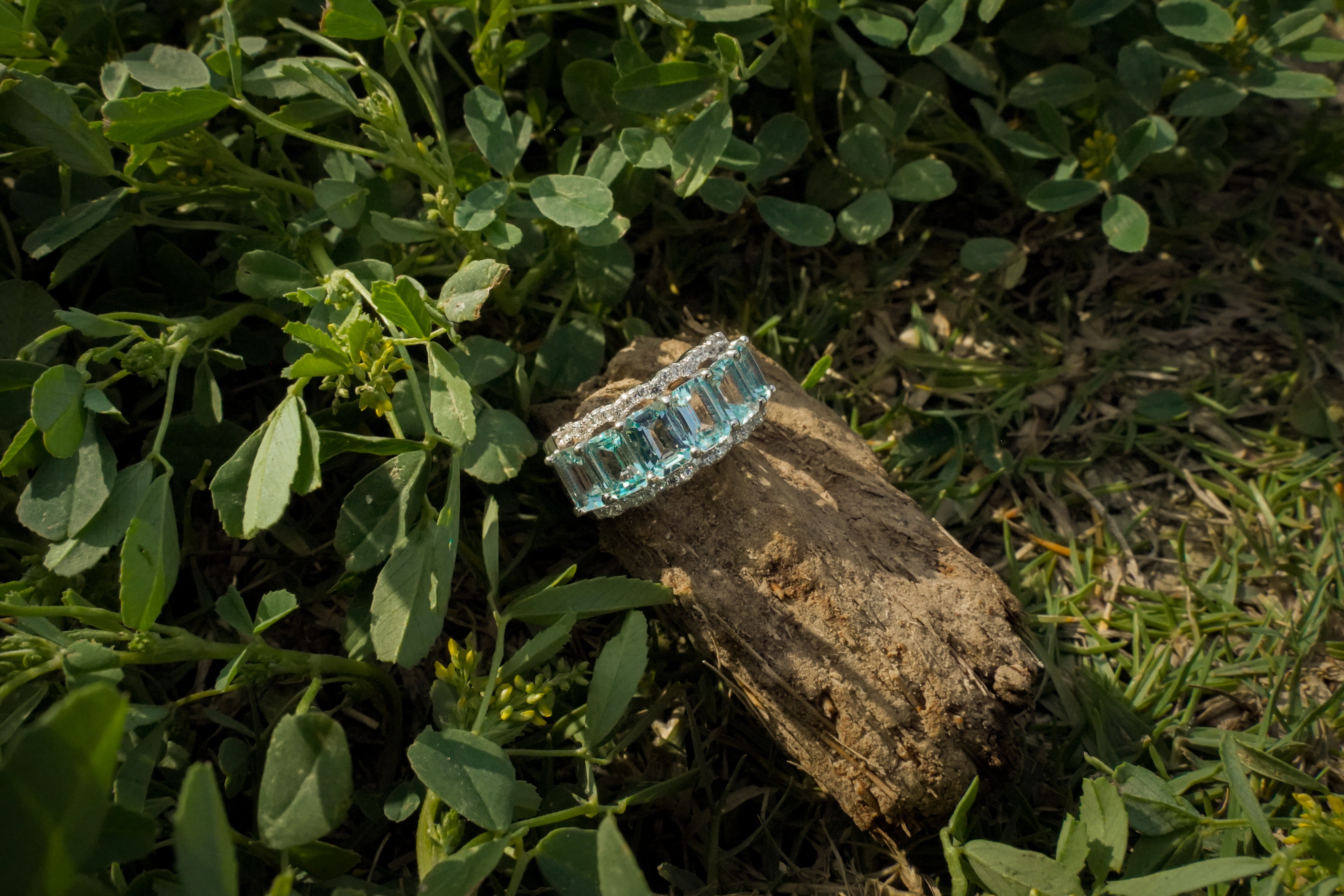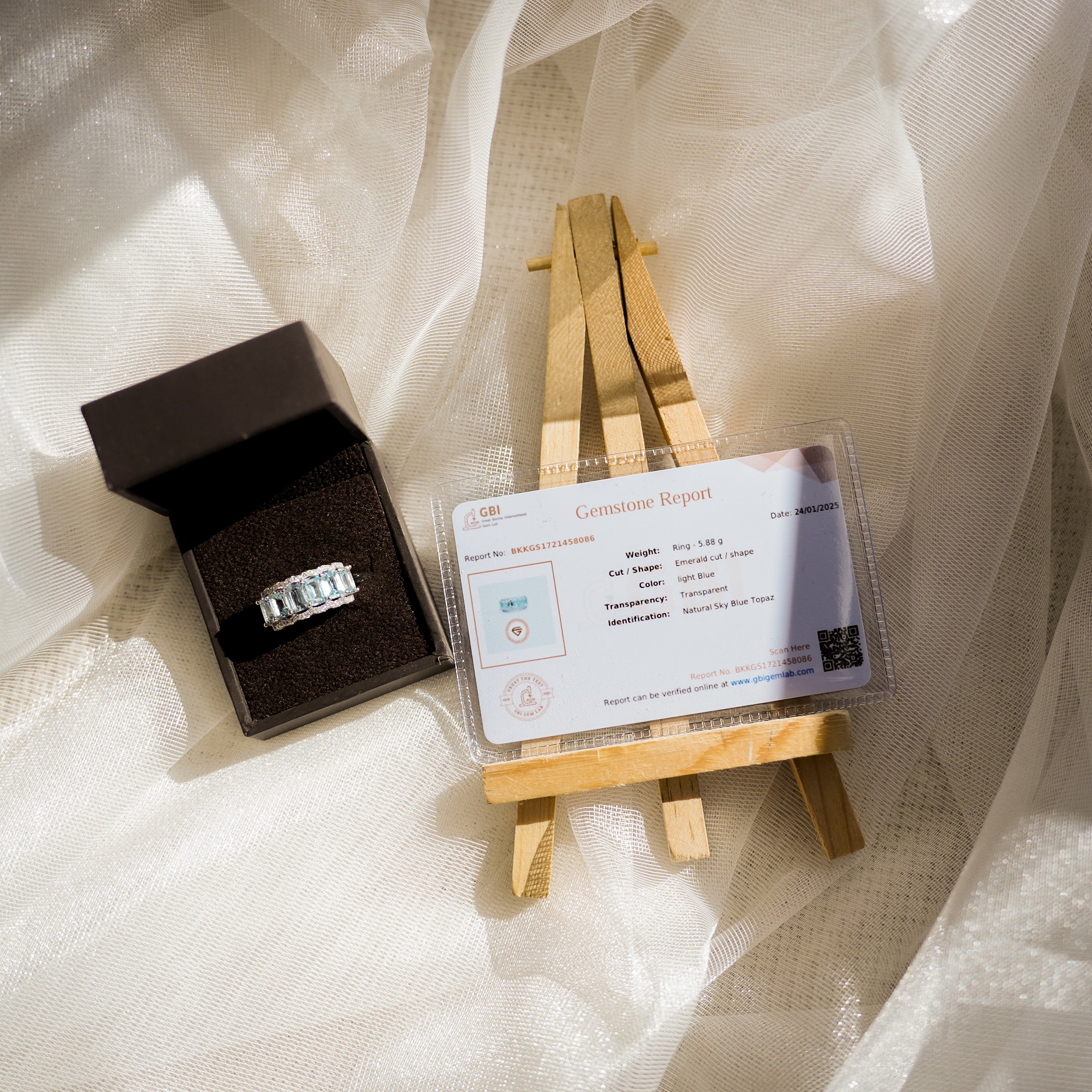 Bold 925 Sterling Silver wide band ring featuring a continuous row of certified blue Topaz and sparkling borders. Kuwait Ministry Stamped.